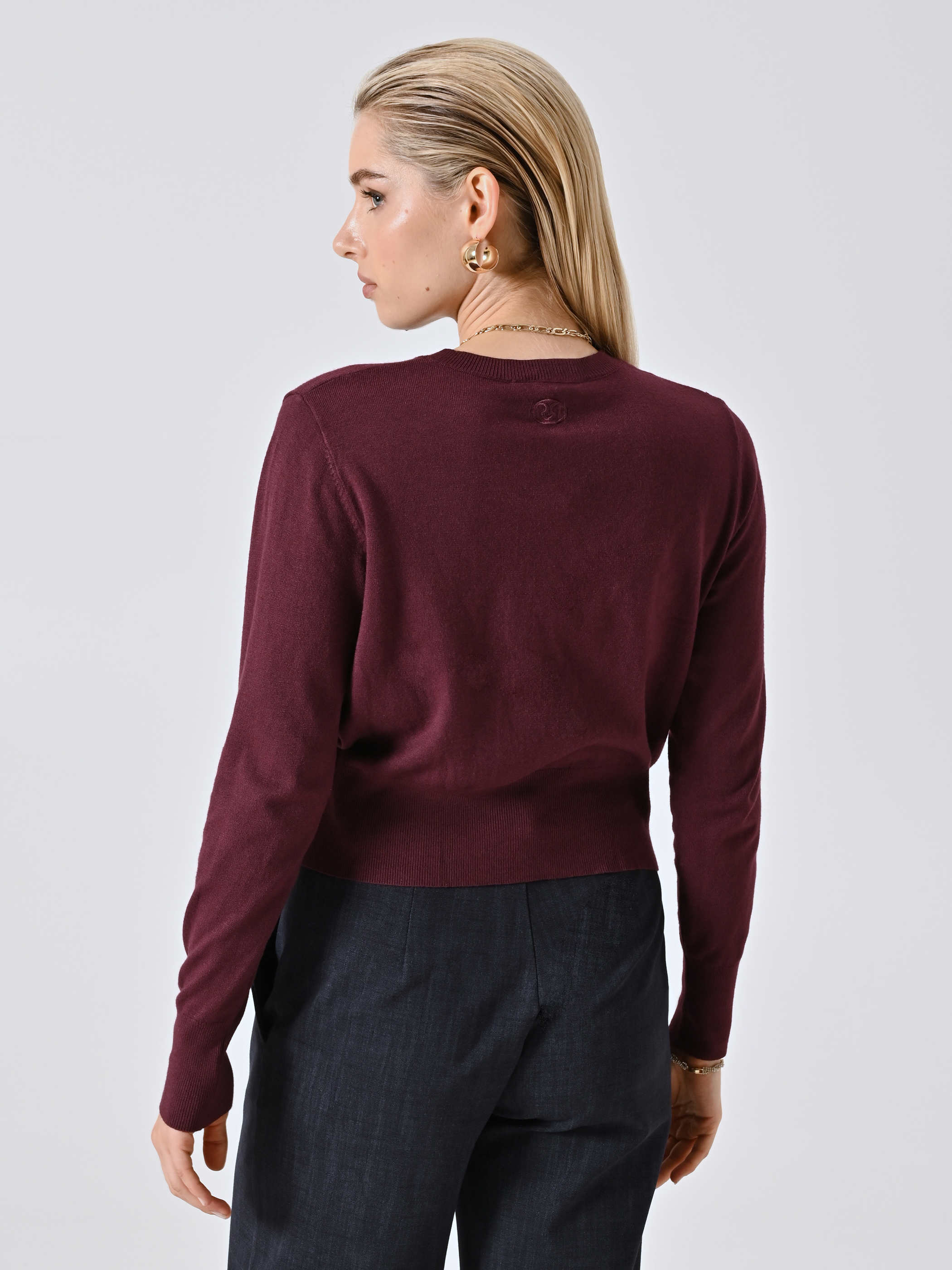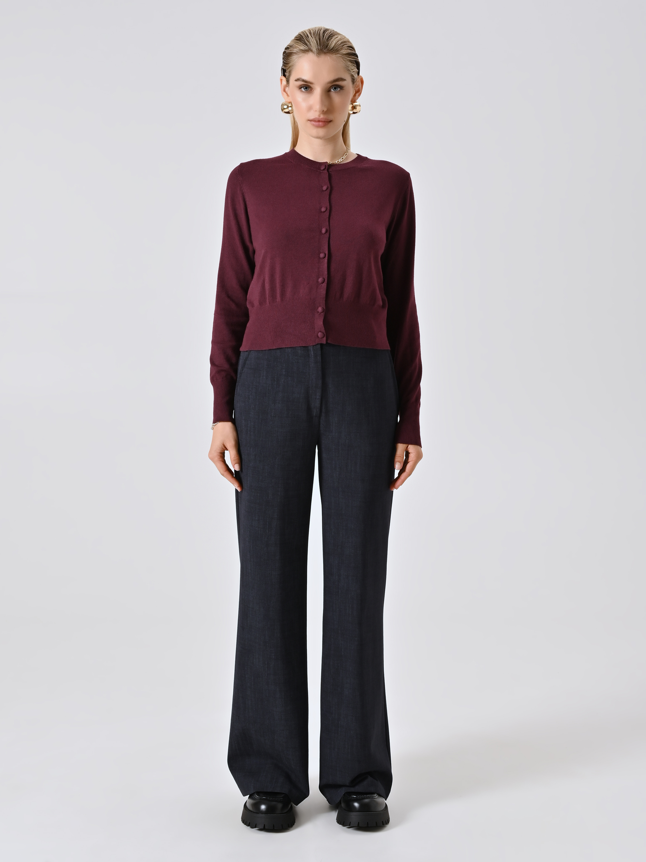 Realizzato in maglia fine, il Cardigan si distingue per il design cropped e i delicati bottoncini ricoperti tono su tono. Il girocollo classico e le maniche lunghe ne fanno un capo perfetto per la mezza stagione, da indossare a pelle o sopra una camicia.