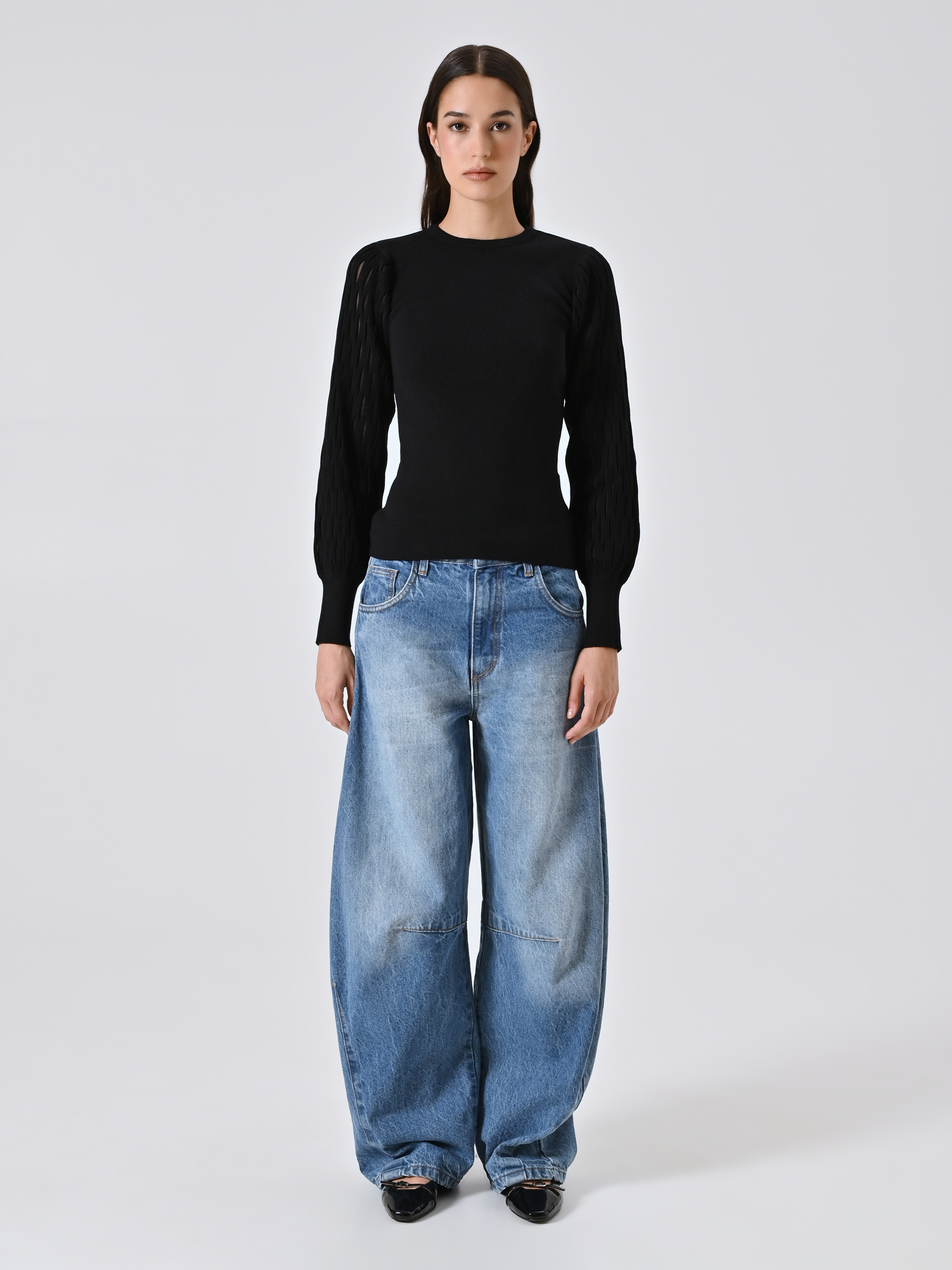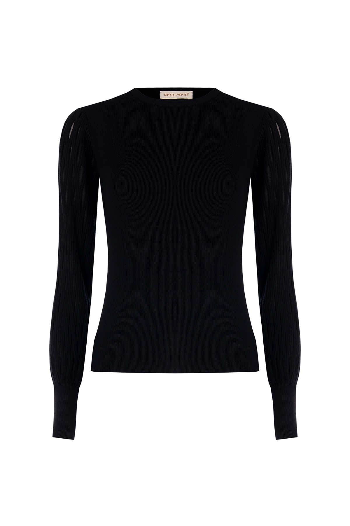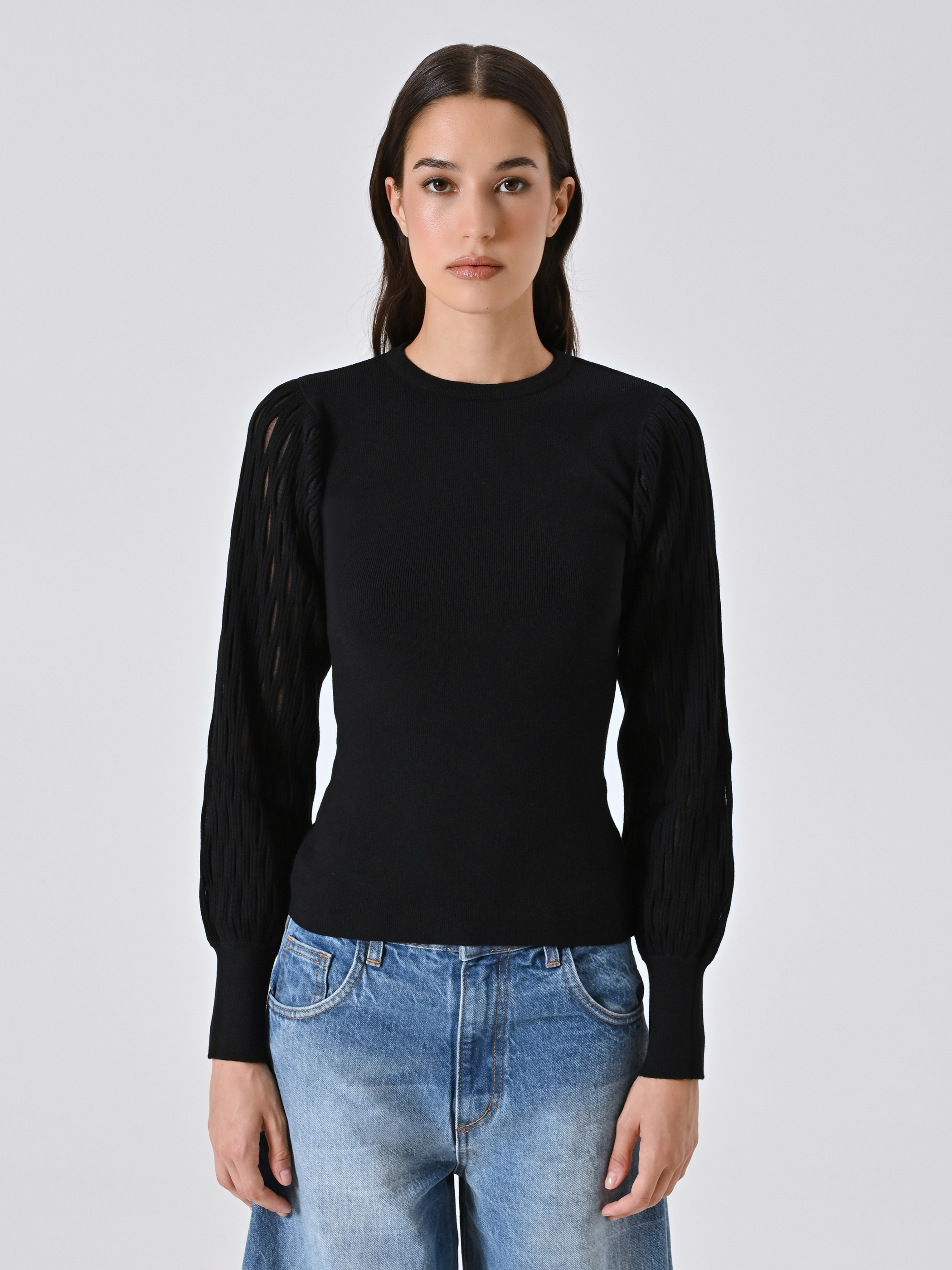 Realizzata in maglia fine, presenta una lavorazione a costine sul corpo e maniche lunghe in punto traforato che aggiungono un dettaglio sofisticato. Il girocollo classico e i polsini alti la rendono versatile e confortevole, ideale per tutte le stagioni.