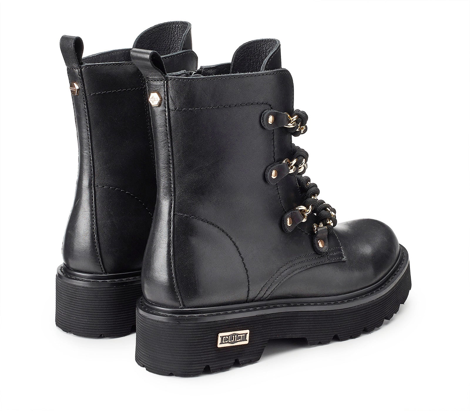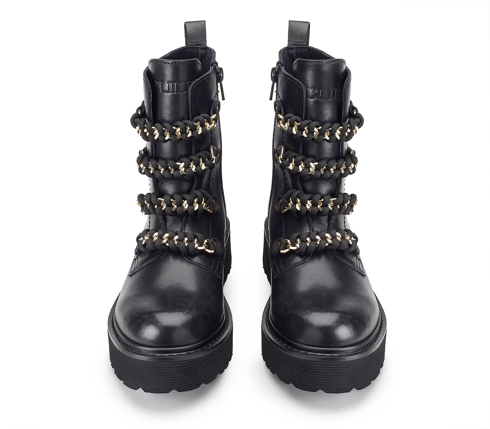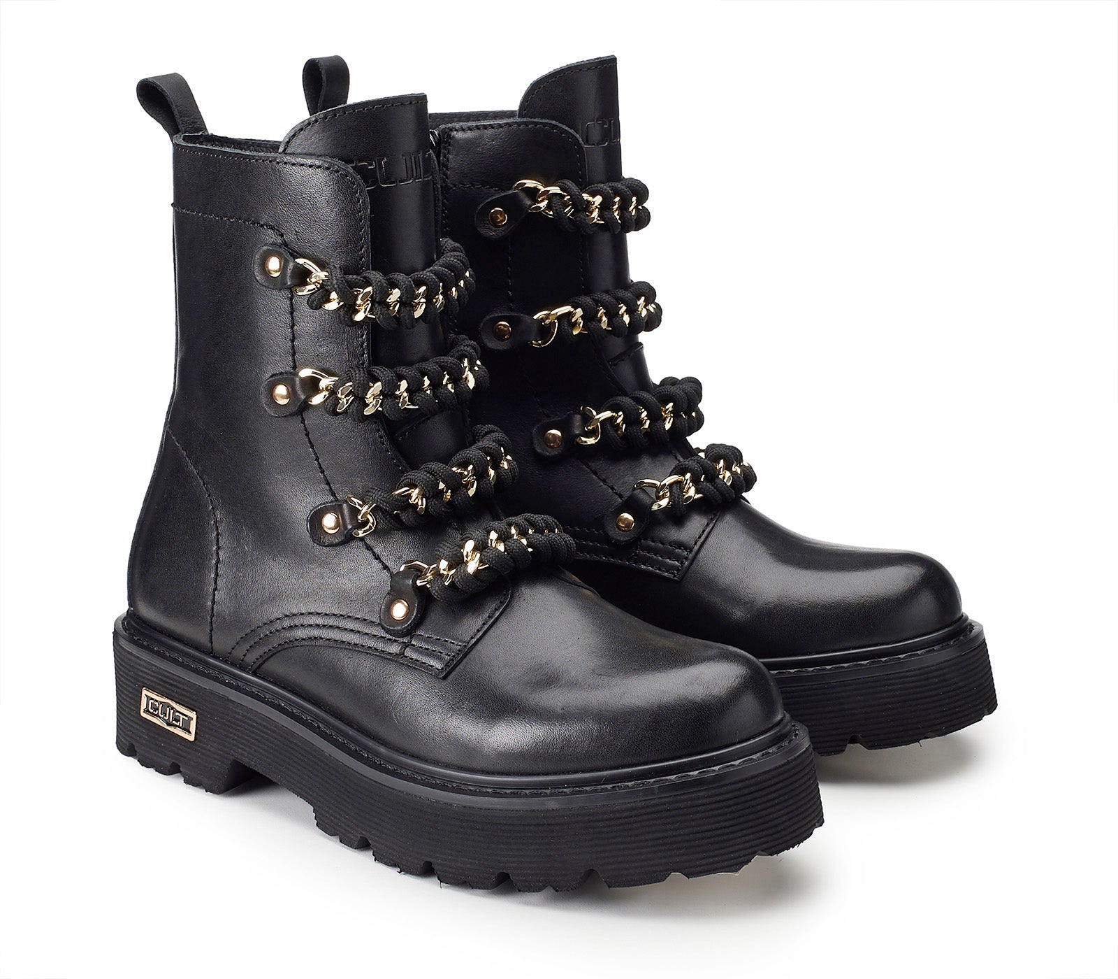 Comodi ma senza rinunciare all'anima rock gli anfibi firmati da Cult per questo inverno. Un modello intramontabile di stivaletti in pelle, arricchiti da nuovo accessorio scoobidoo catena: un'accattivante lavorazione ad intreccio su catena metallica diamantata al posto dei lacci, targhetta con logo del brand sulla suola in EVA extralight e tirante posteriore, chiusura con zip. Da indossare con jeans, pantaloni o gonne corte.