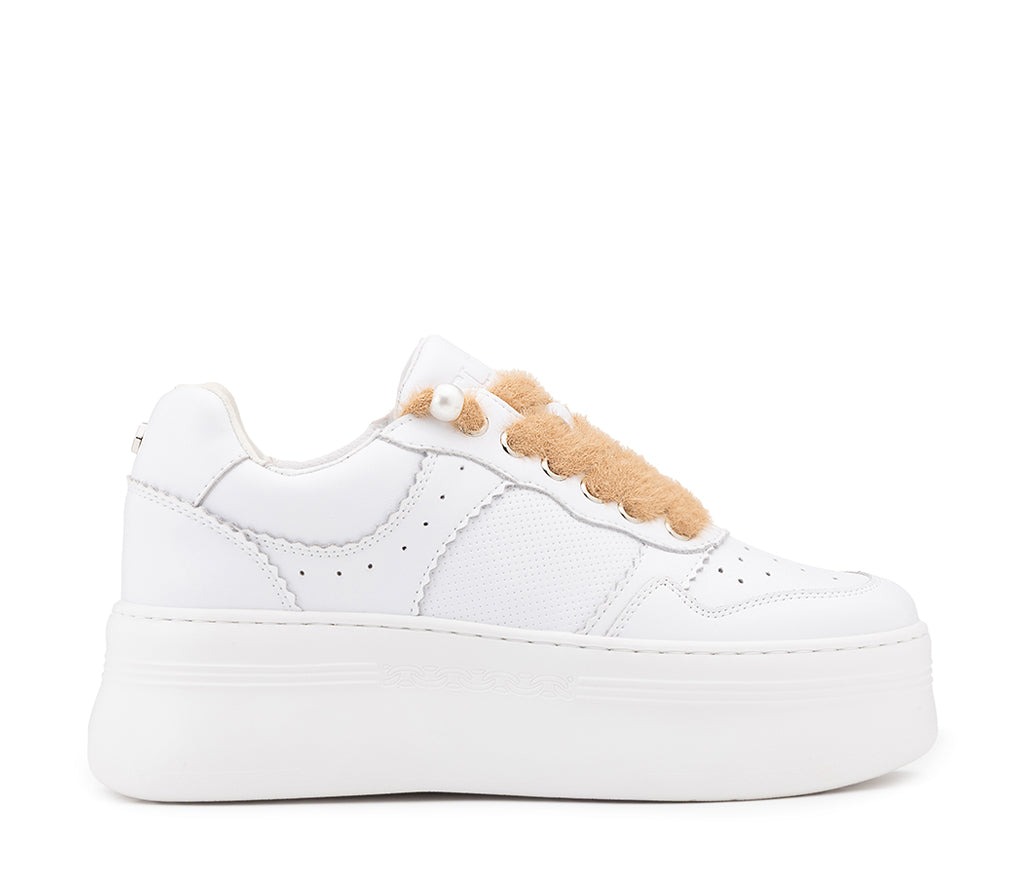 Una sneaker che rompe le regole grazie al suo tocco originale. Realizzata in pelle bianca, dalle linee pulite e silhouette minimal, questa scarpa si distingue per il suo dettaglio più audace: i lacci in eco-pelliccia, morbidi e sfacciatamente pop. E' una dichiarazione di stile: irriverente, femminile, contemporanea. Il secondo paio di lacci alternativi in nylon bianco è incluso.