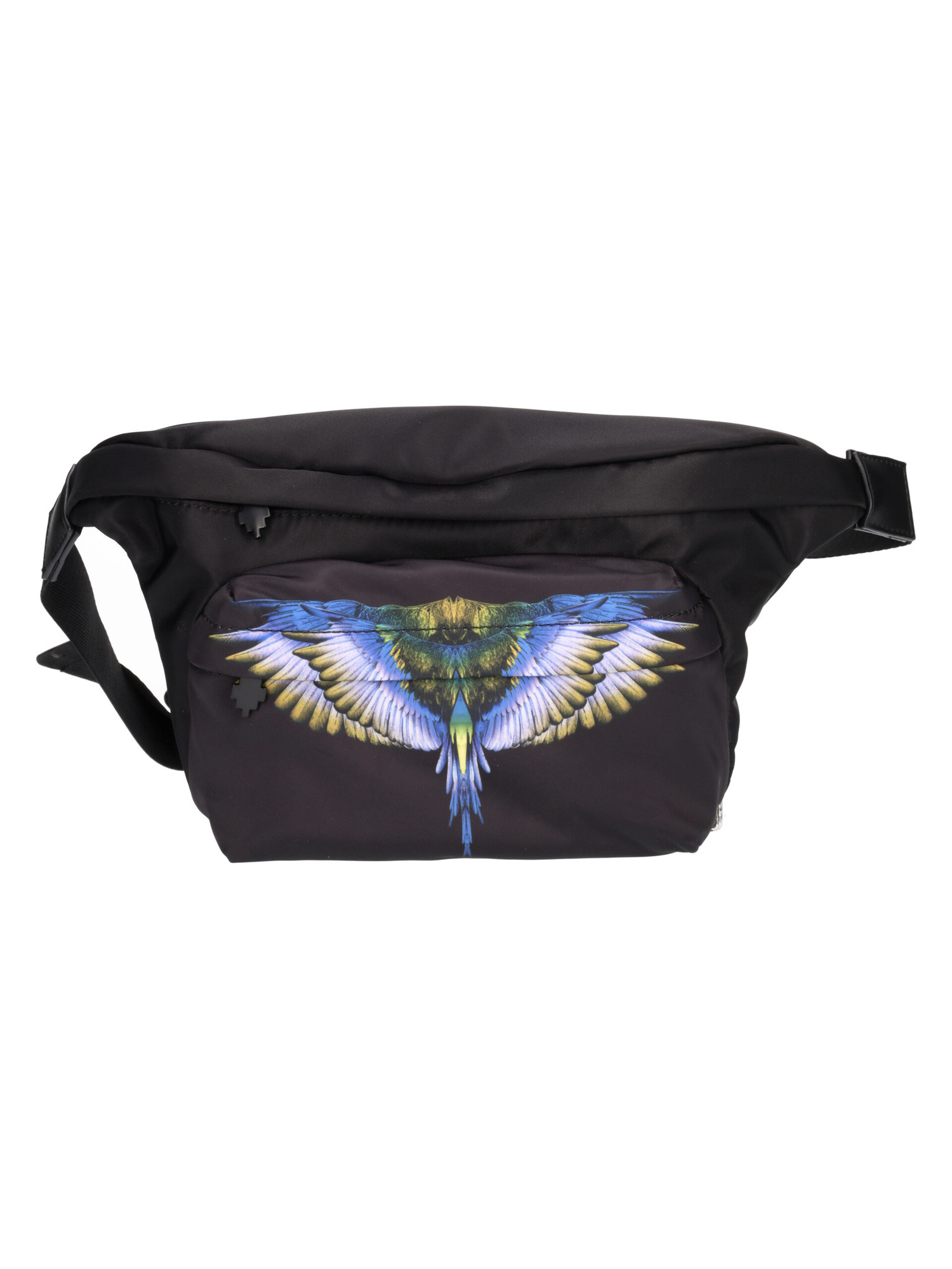 Borsa con stampa ali blu, zip centrale, taschino interno e tasca esterna sempre zip.