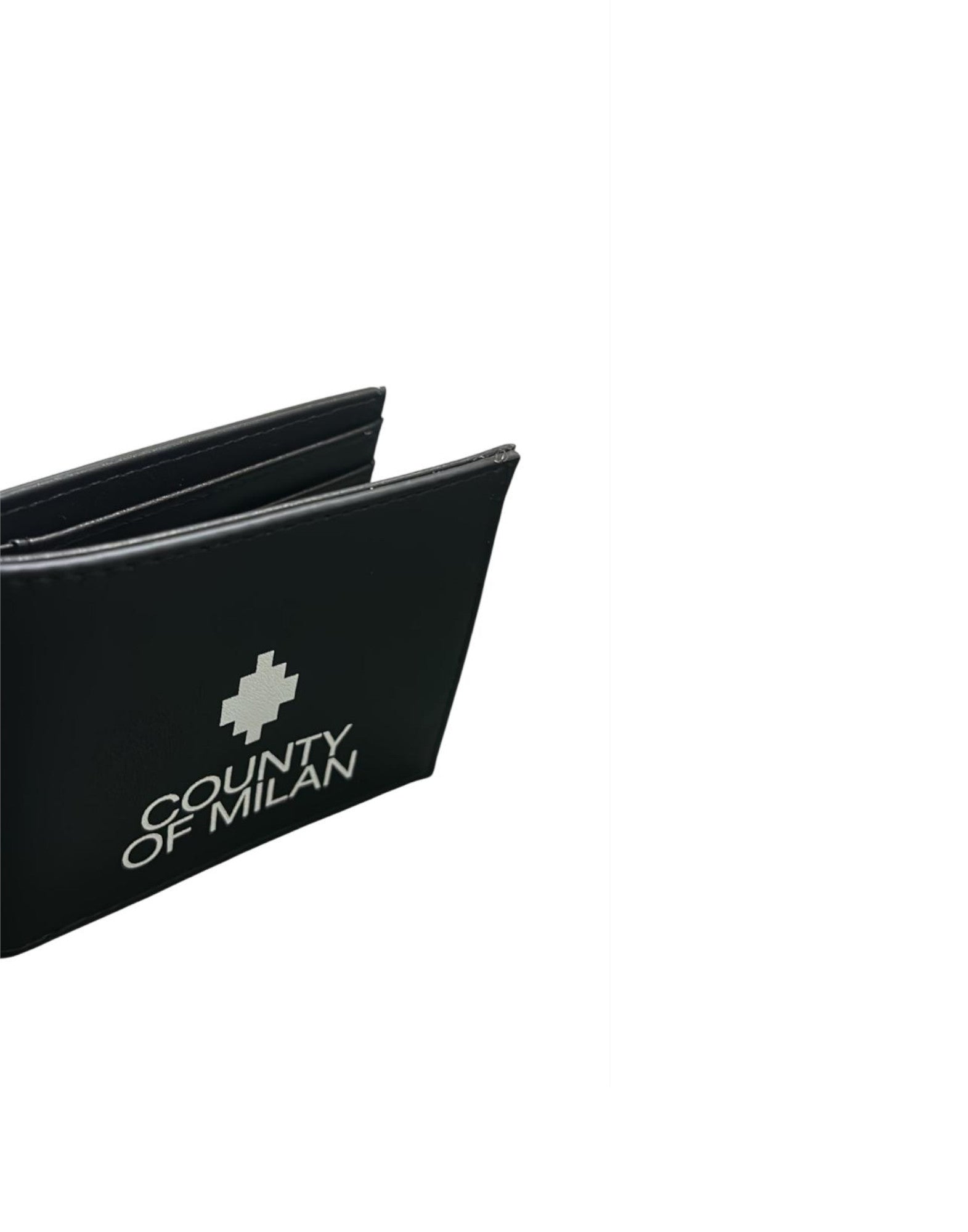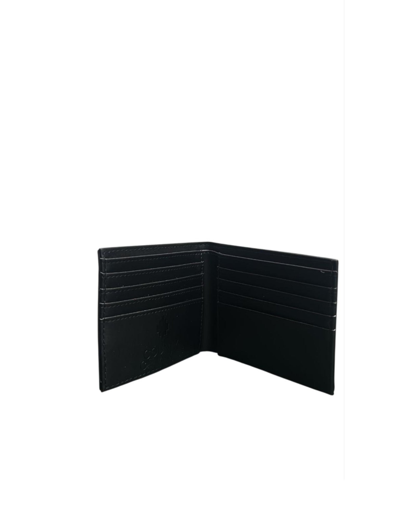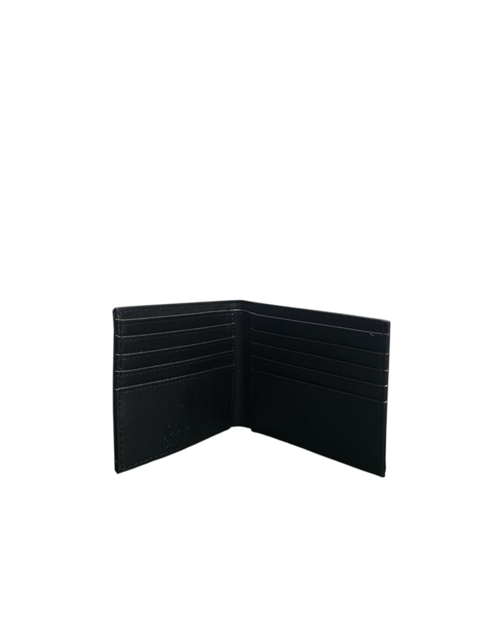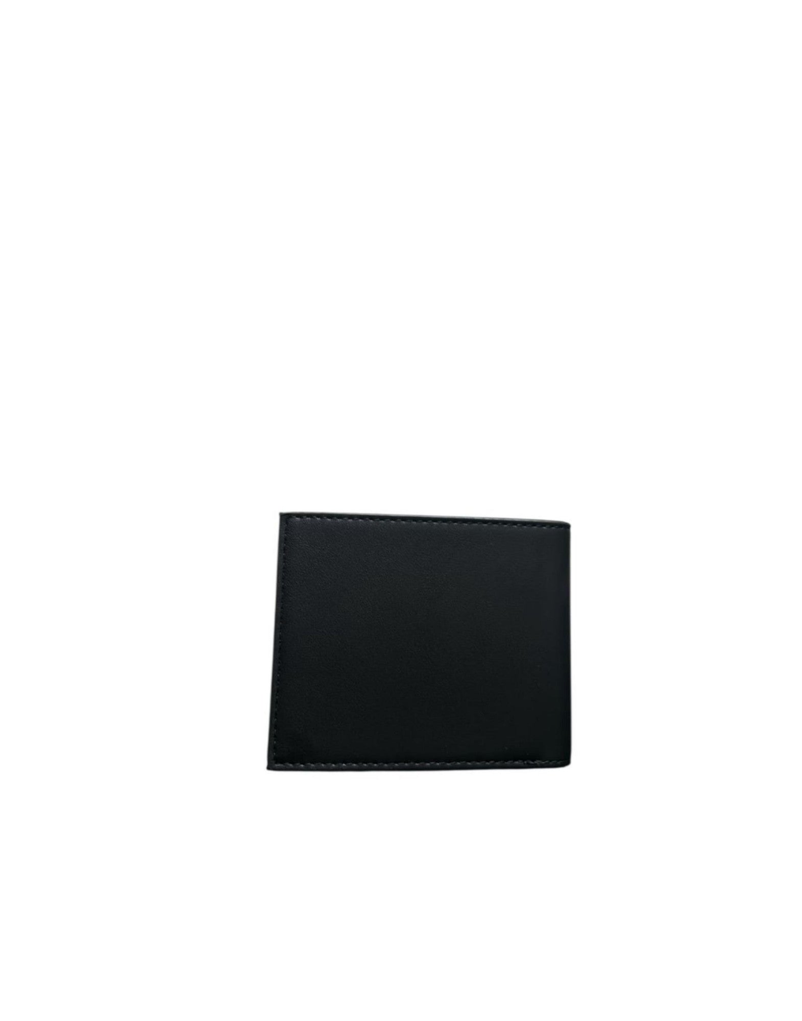 Portafoglio da uomo in ecopelle nera con logo bianco, scomparti per carte ed uno per le banconote.