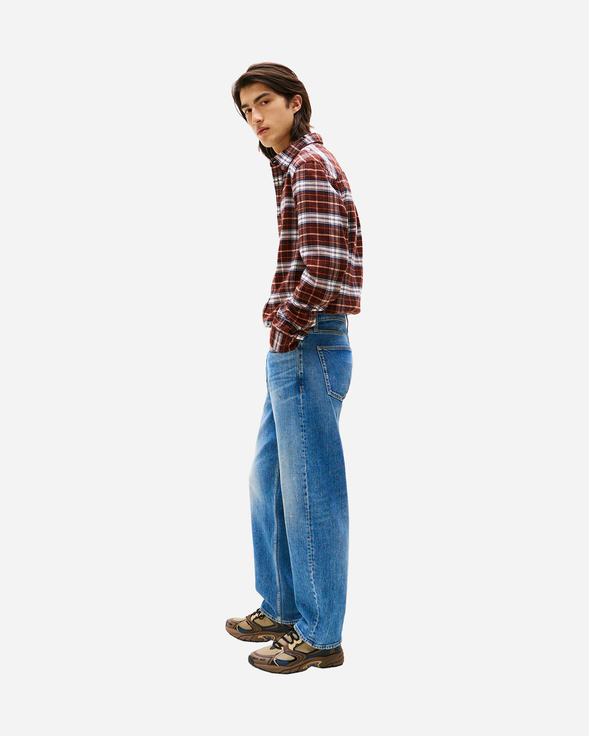 Jeans modello cinque tasche Vestibilità regular con gamba dritta Taglio cropped alla caviglia Tessuto con lavaggio sbiadito Chiusura con zip e bottone Logo ricamato sul taschino