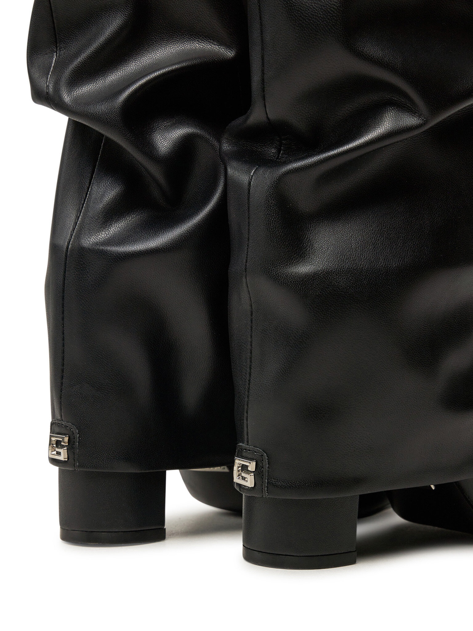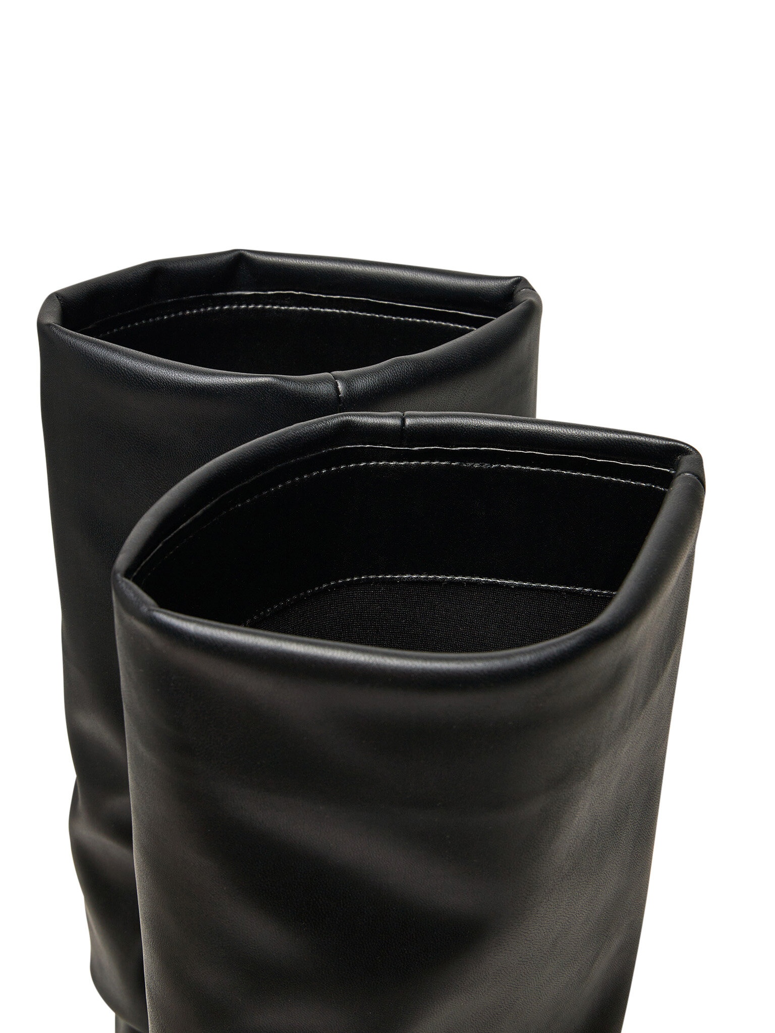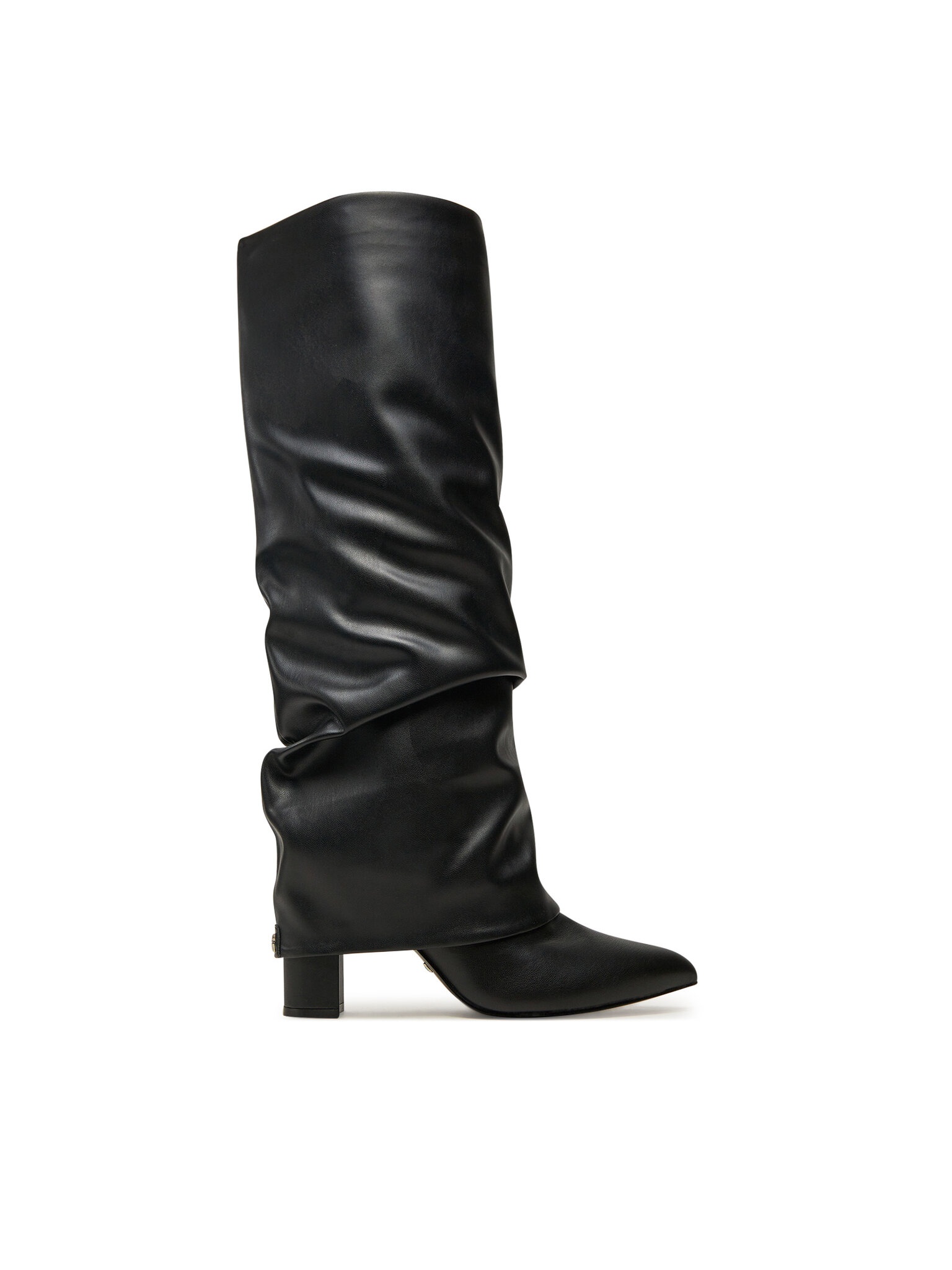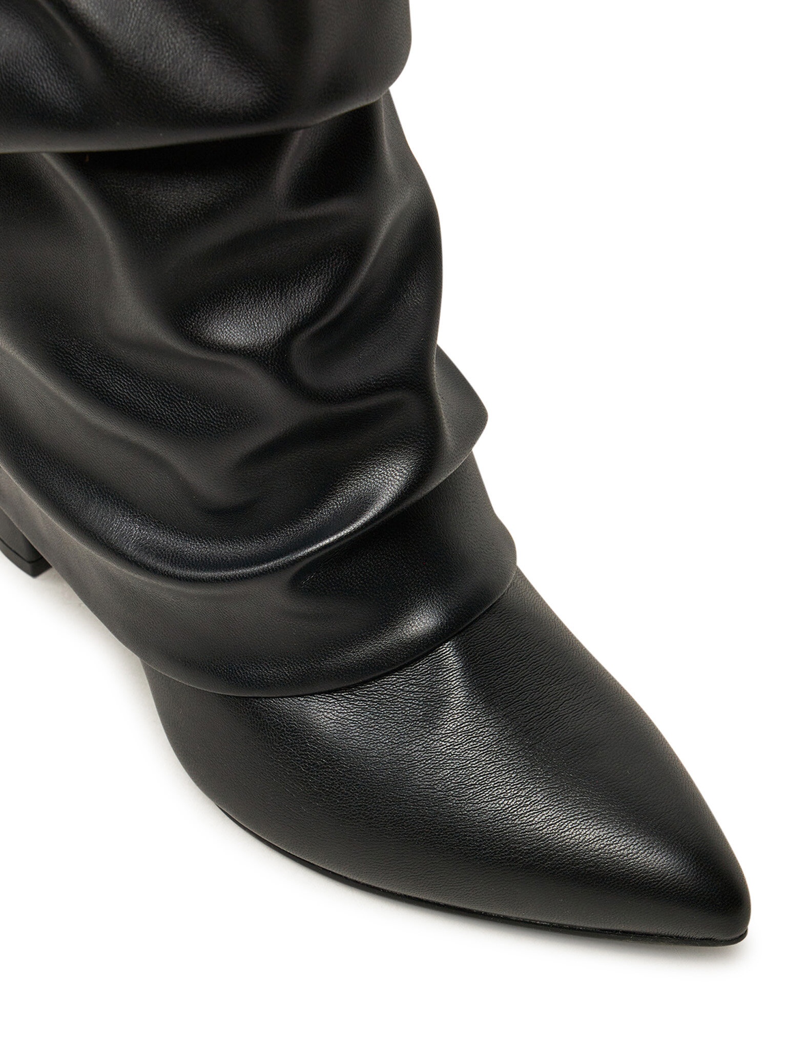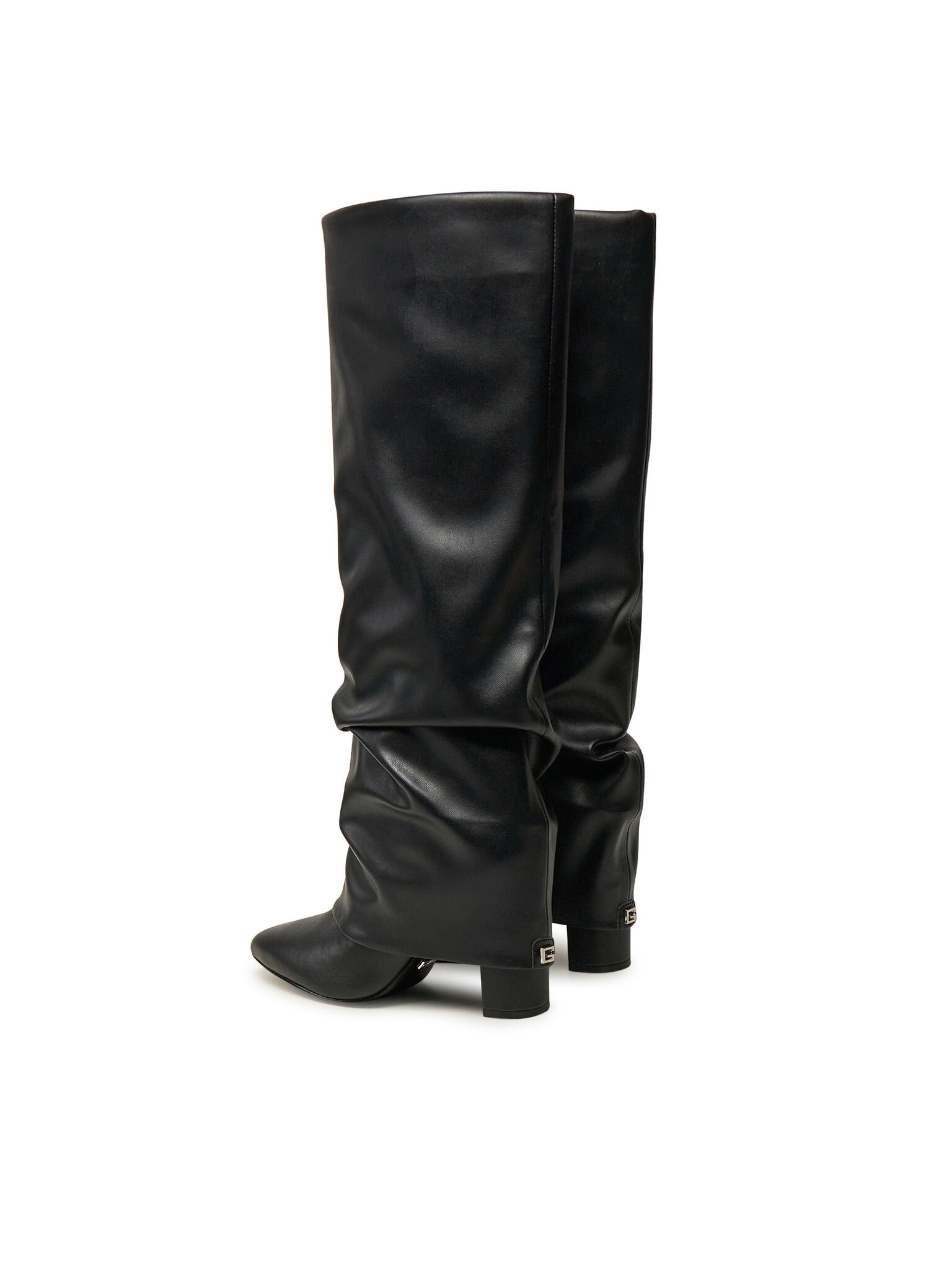* Stivale alto al ginocchio.* Forma affusolata nella parte superiore, con effetto arricciato.* Tacco squadrato.* Punta leggermente allungata.* Logo presente sul retro del tacco.* Materiale liscio e strutturato.