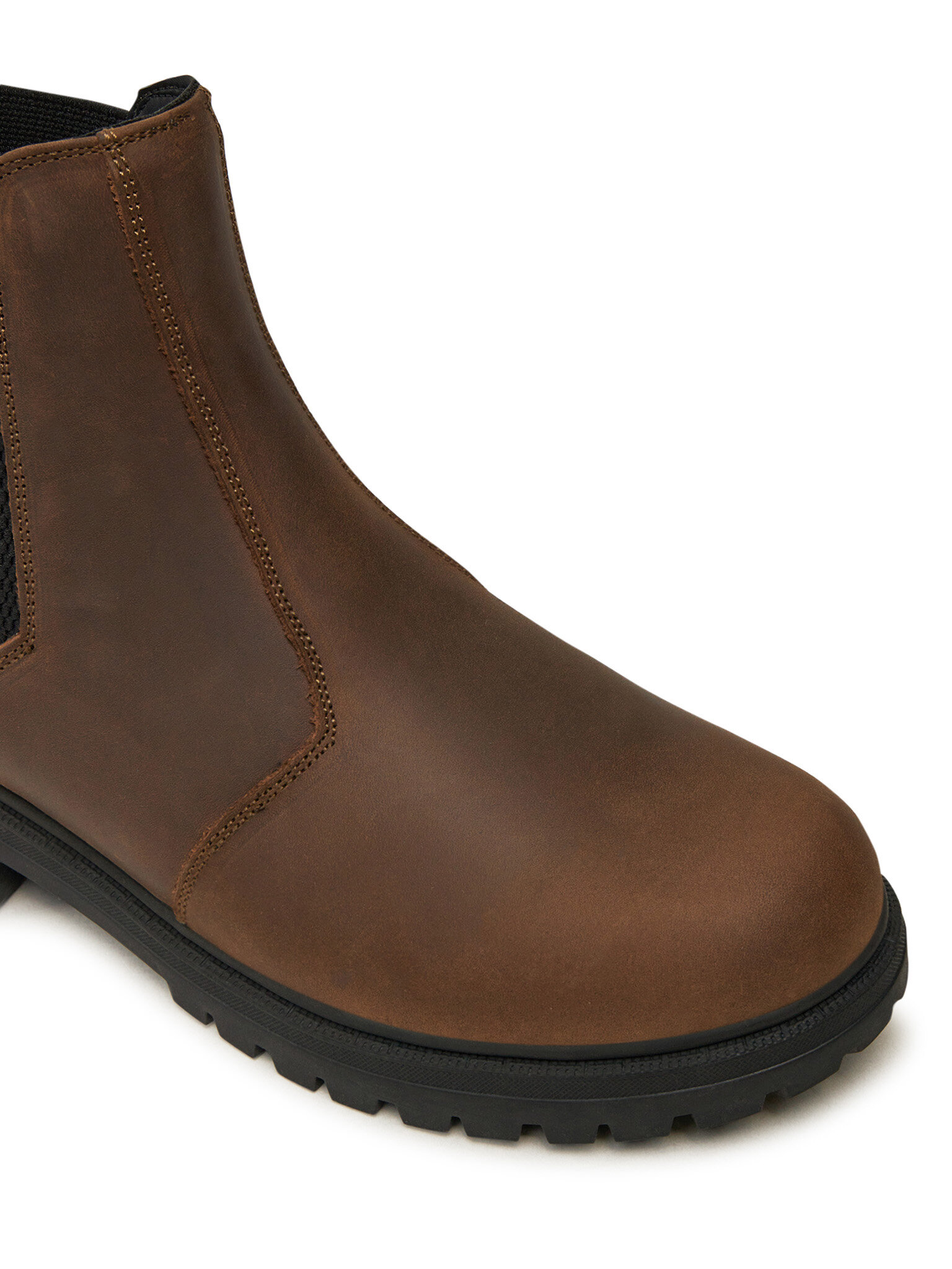 - Stivaletto stile Chelsea con suola robusta e scolpita.- Inserti elastici laterali per una calzata comoda.- Finitura liscia e resistente.- Linguetta posteriore per facilitare l'indossamento.- Design semplice e funzionale.