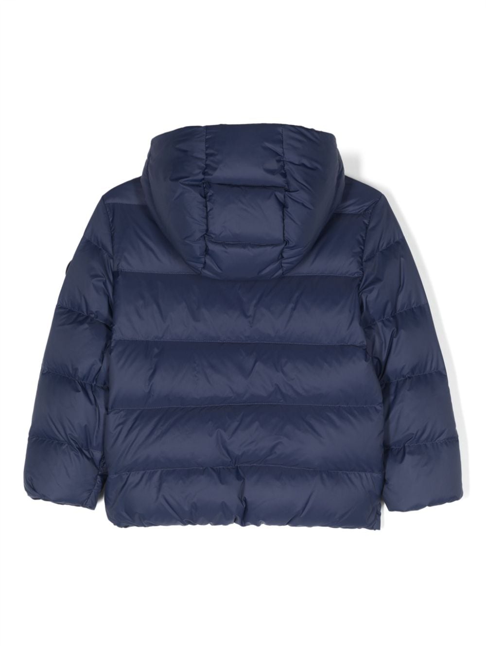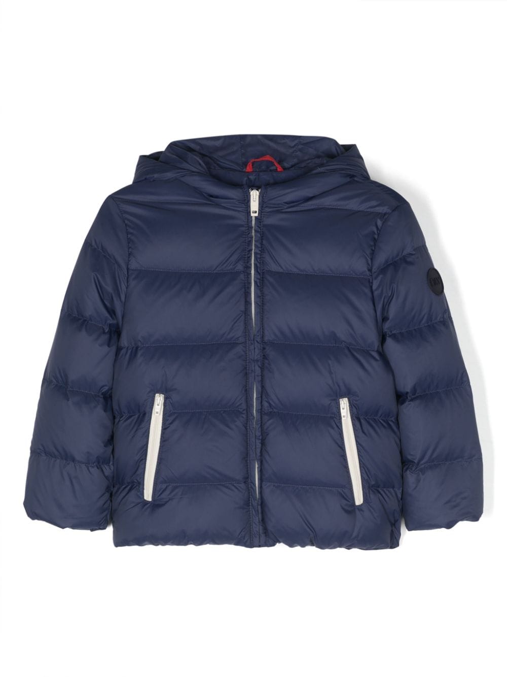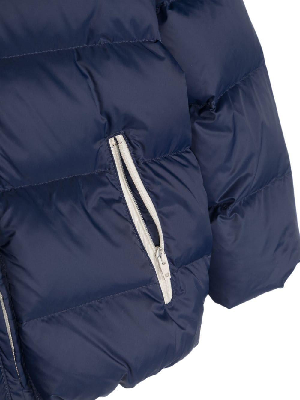 Piumino d'ocaDesign imbottitoDesign trapuntatoApplicazione sulla manica con logoBordo a contrastoCappuccioChiusura frontale con zipManiche lungheDue tasche laterali con zipOrlo dritto