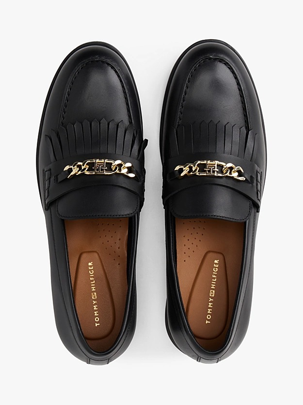 I mocassini classici, in pelle liscia con frange sul davanti, si distinguono per l'originale catenella lucida impreziosita dal monogramma TH.