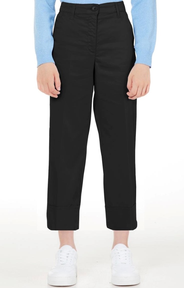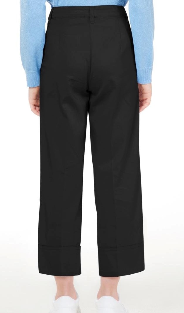 Pantaloni dritti con placca logo, vita media, taglio straight, passanti, chiusura con bottone e zip nascosta, due tasche diagonali laterali e orlo dritto