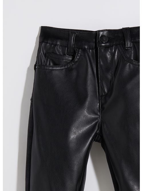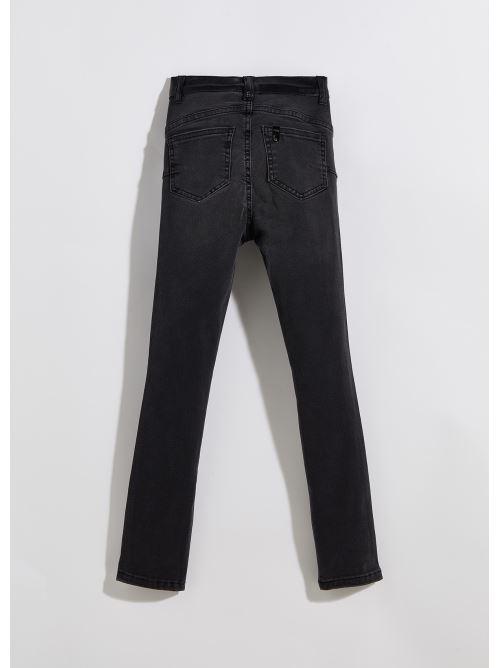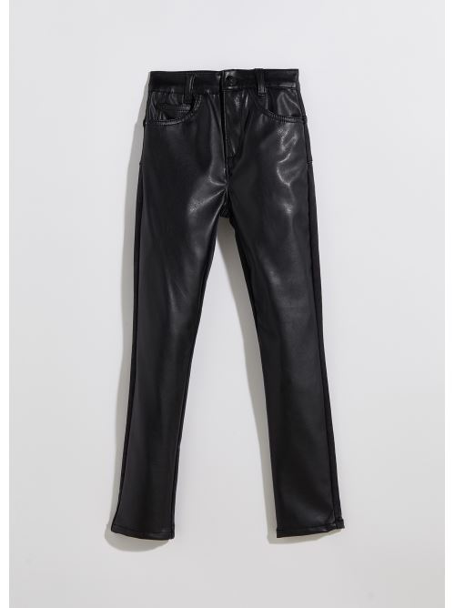 Pantalone skinny in denim neroInserto in tessuto spalmato stretch sul davantiVita altaComode tascheChiusura con zip e bottone54% Cotone, 30% Viscosa, 14% Poliestere, 2% Elastan