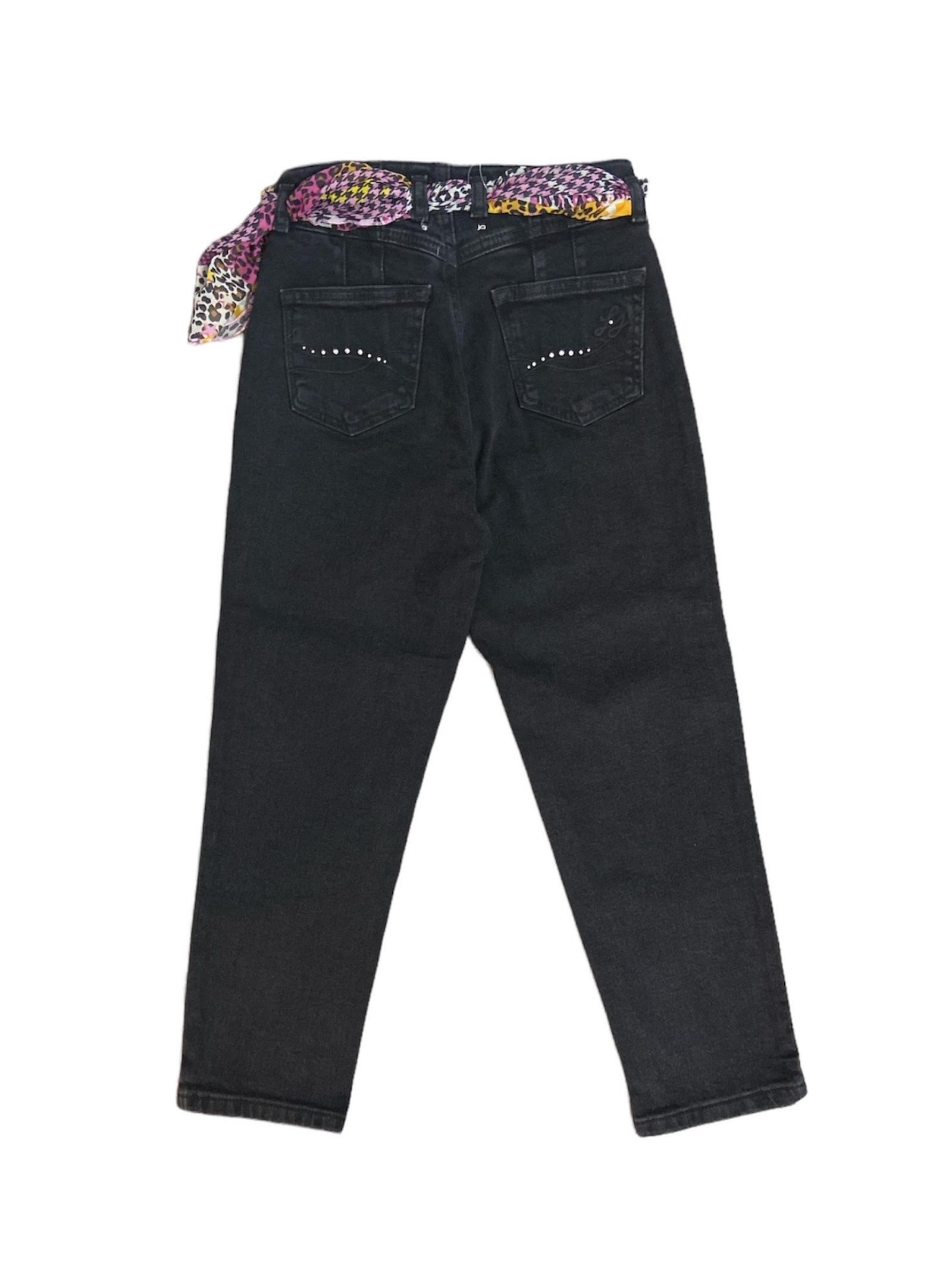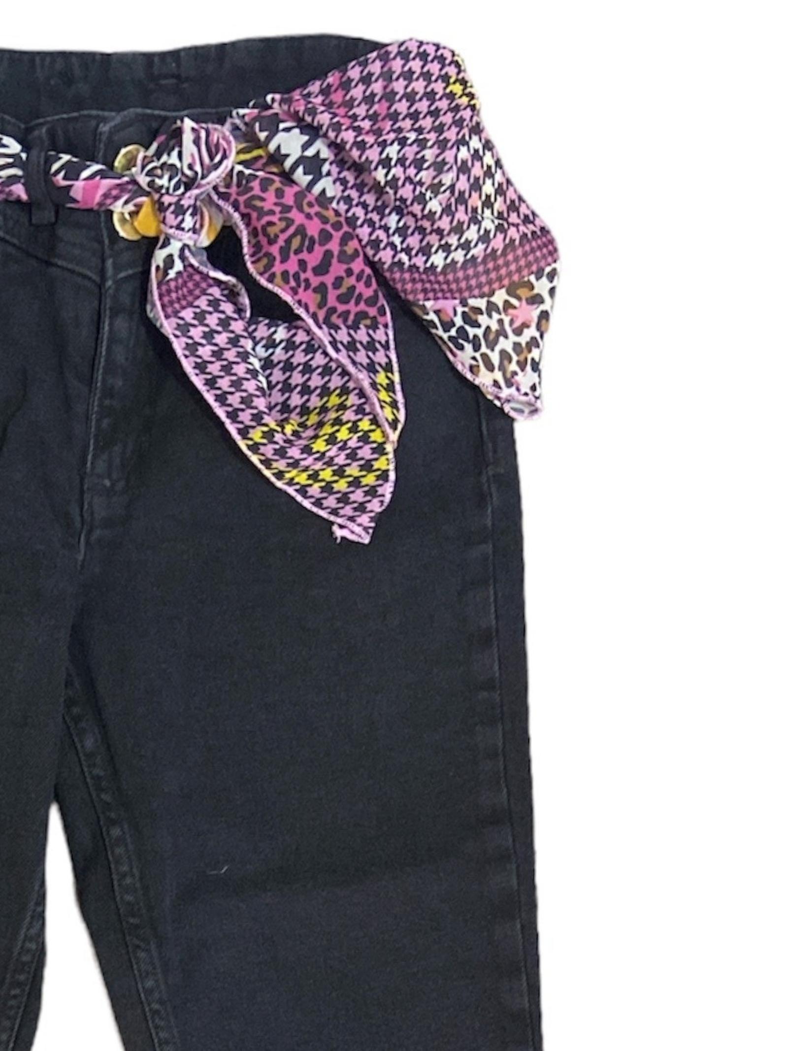 Modello vita alta, dettaglio posteriore applicazione brillantini in contrasto, tasche tinta su tinta.Chiusura anteriore con zip e bottone.In coordinato foulard multicolor.Vestibilità regolare.