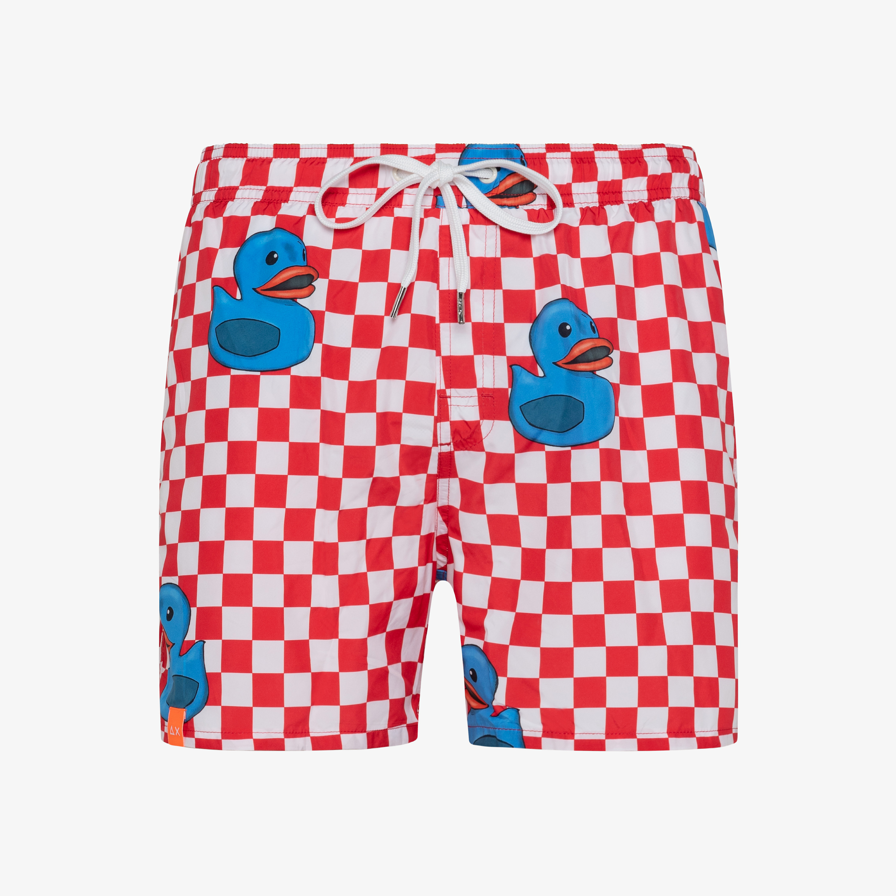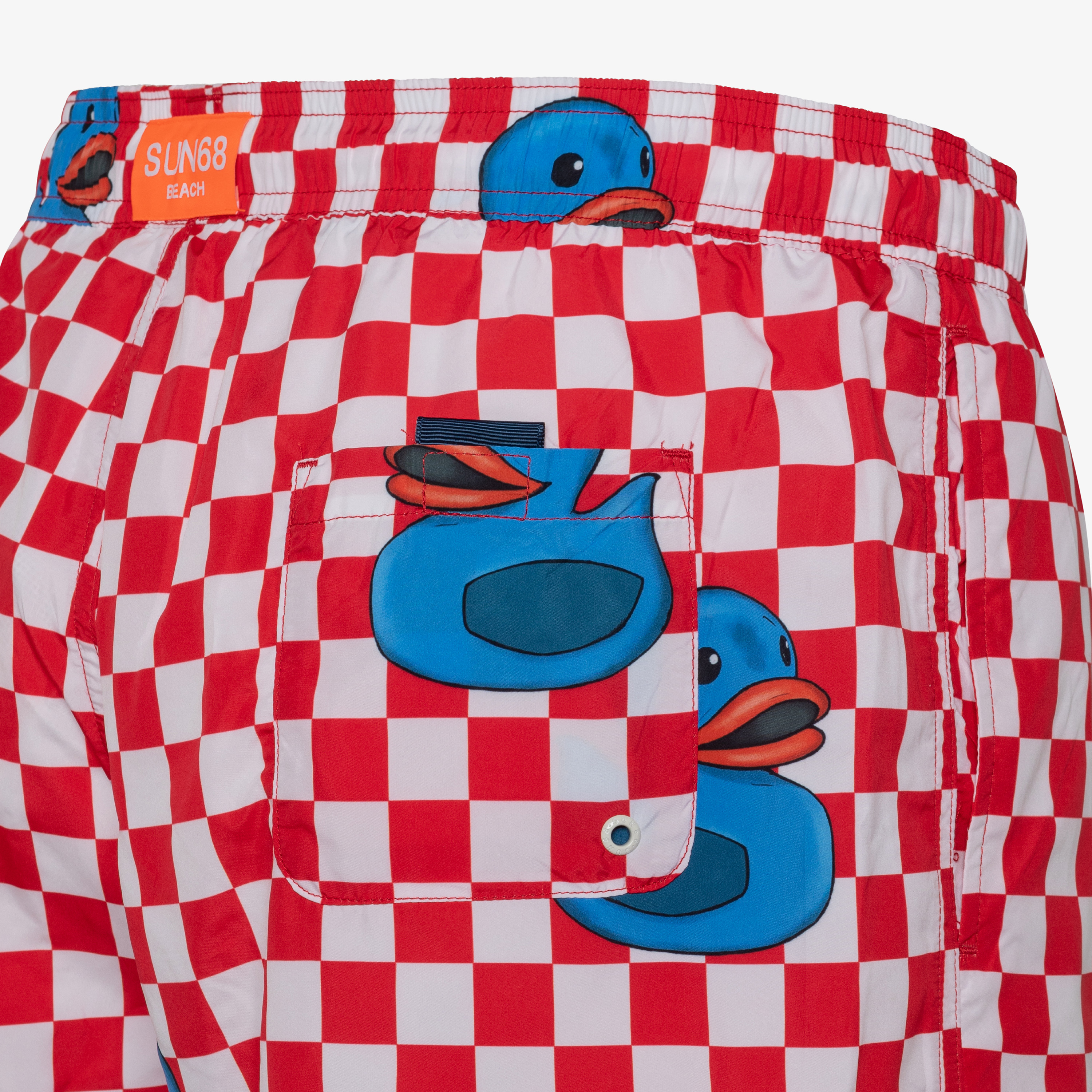 Costume da bagno con fantasia all-over a scacchiera e paperelle, chiusura modello tramite lacci, vita elasticizzata, tasca posteriore