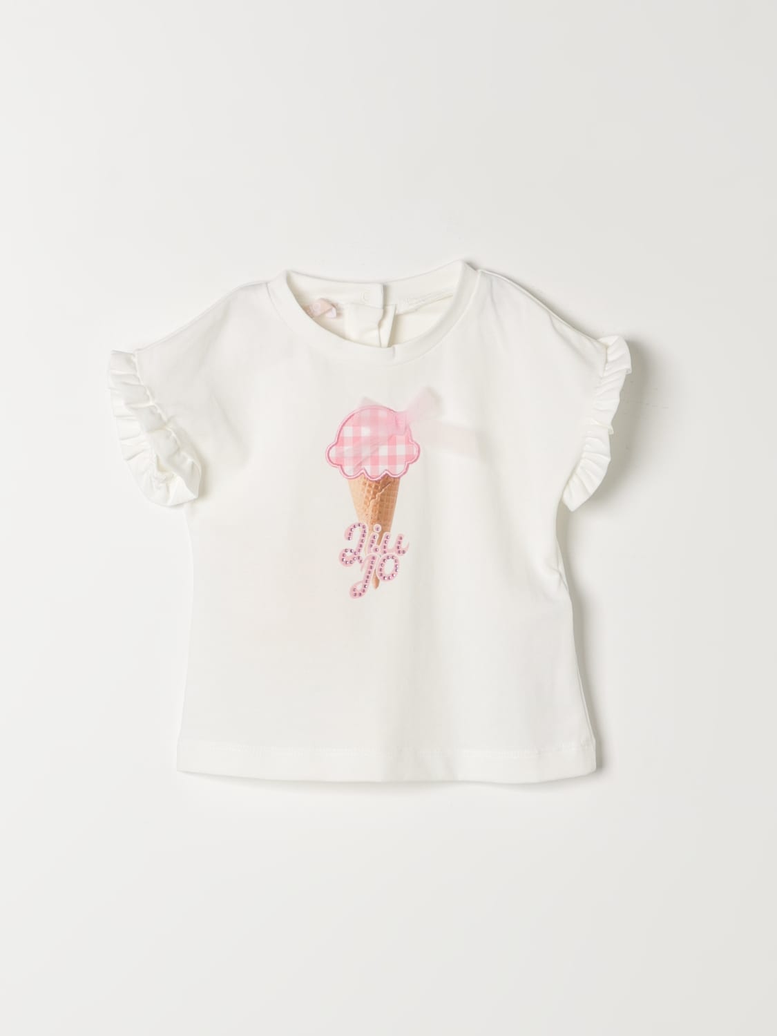 T-shirt con fantasia a tema gelato posta sulla parte frontale, girocollo, chiusura posteriore tramite bottoni, orlo dritto, maniche corte