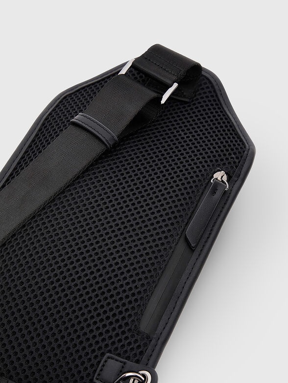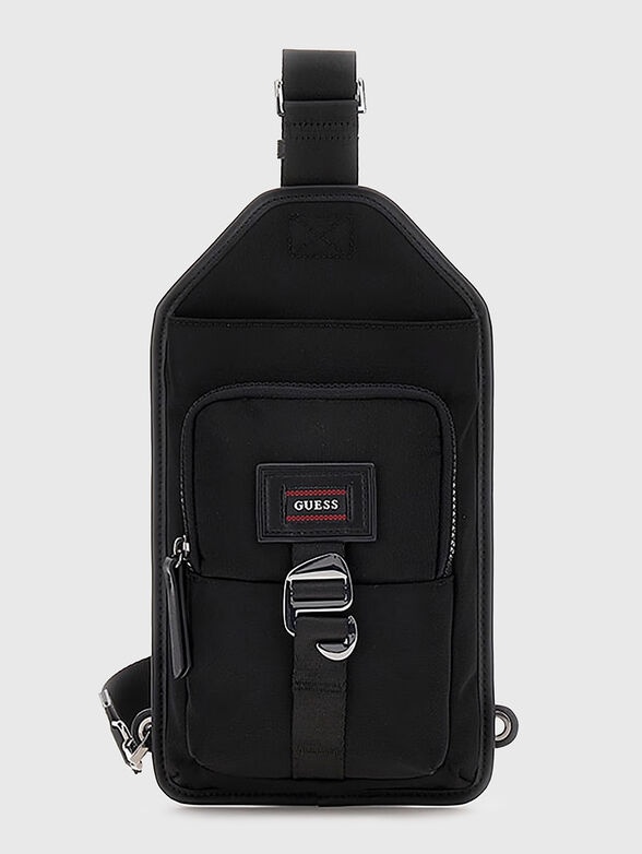* Fibbia di chiusura visibile sulla tasca frontale.
