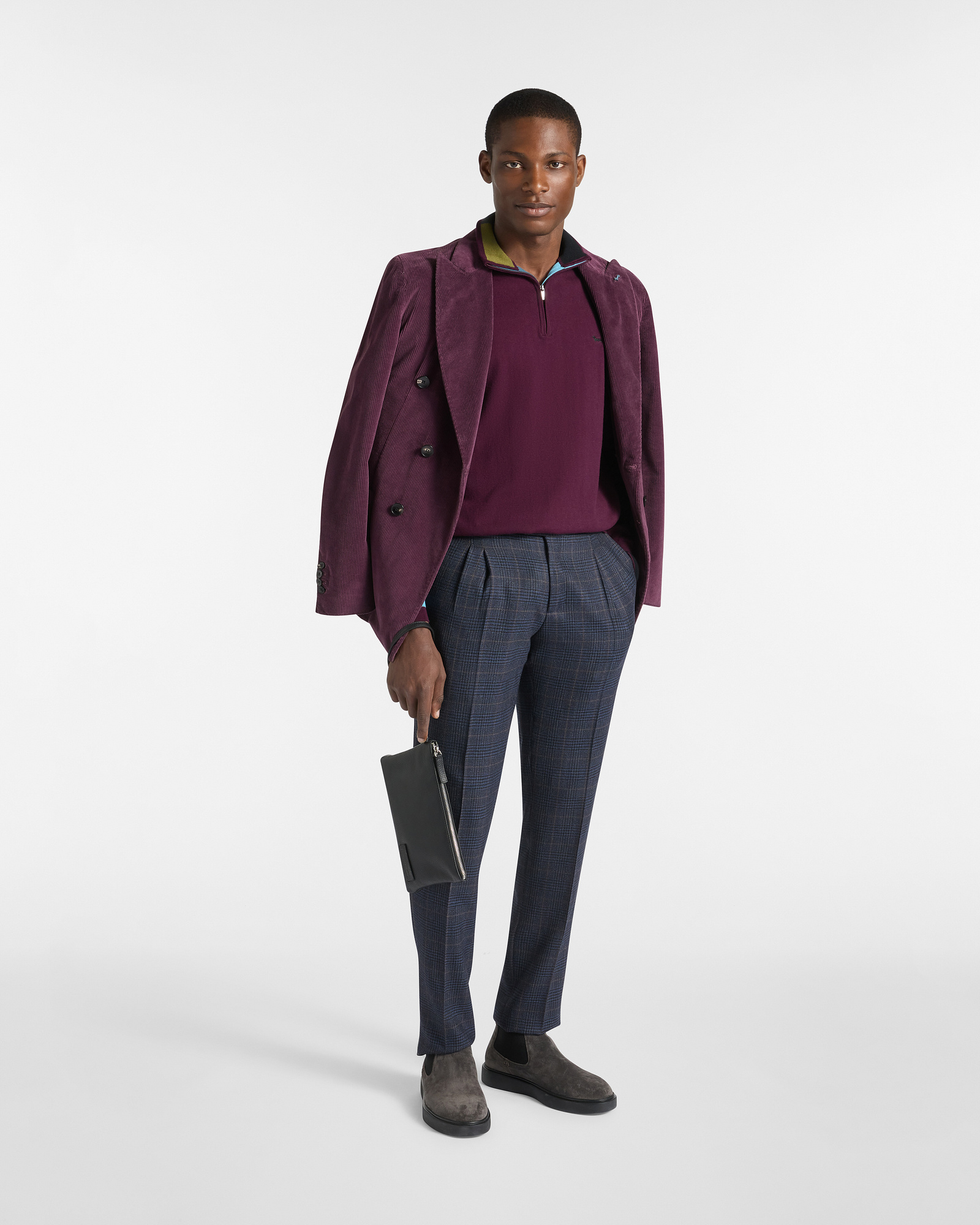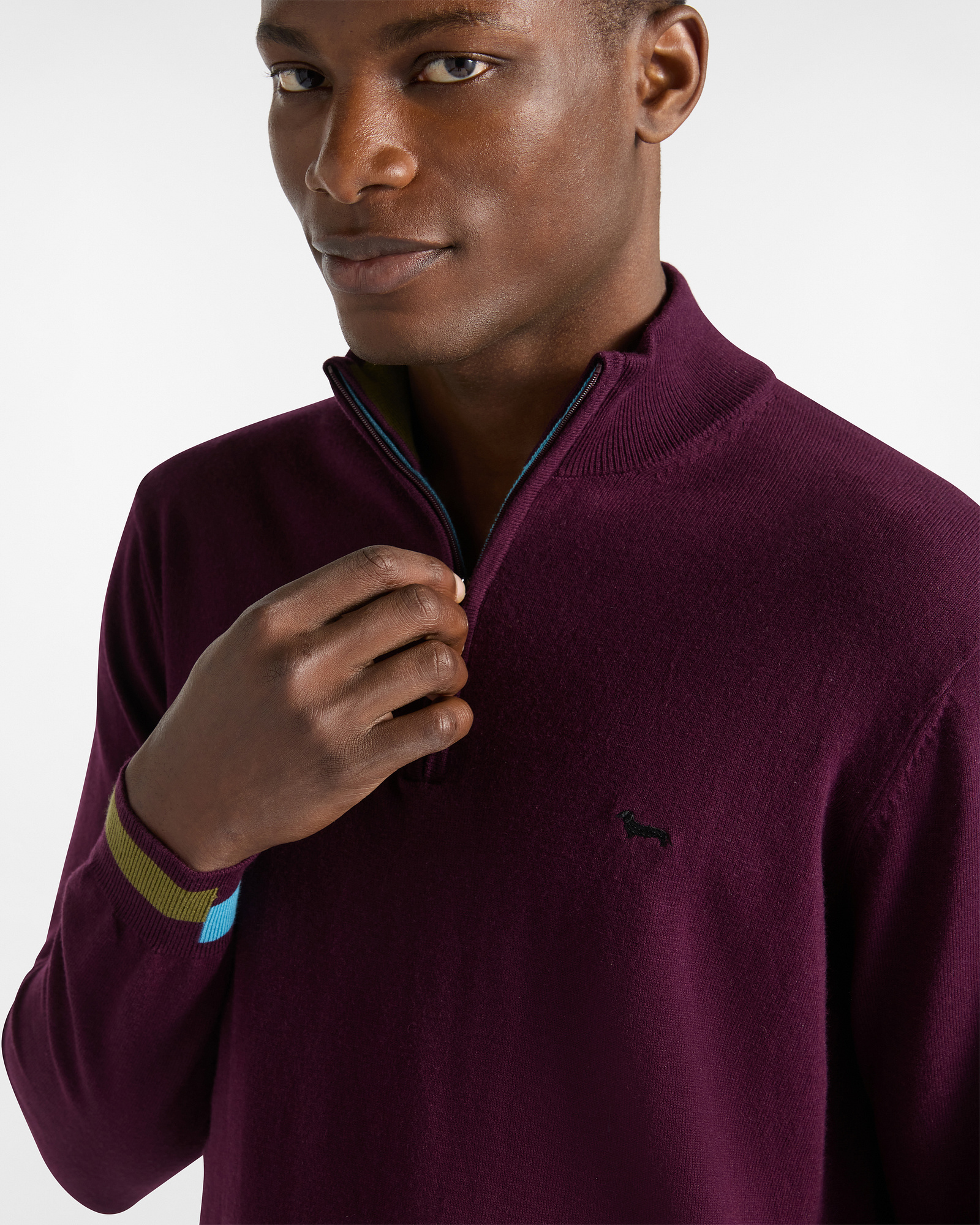 Un equilibrio perfetto tra comfort e stile contemporaneo. Questo pullover da uomo è realizzato in un pregiato mix di lana e cotone, che garantisce morbidezza, traspirabilità e calore. Il modello presenta collo alto con zip, polsini e fondo lavorati a costina e dettagli color block a contrasto, che aggiungono un tocco grafico e dinamico al design essenziale. Il logo del bassotto ricamato tono su tono sul petto completa il capo con discreta eleganza. Perfetto per il tempo libero o per look casual curati.