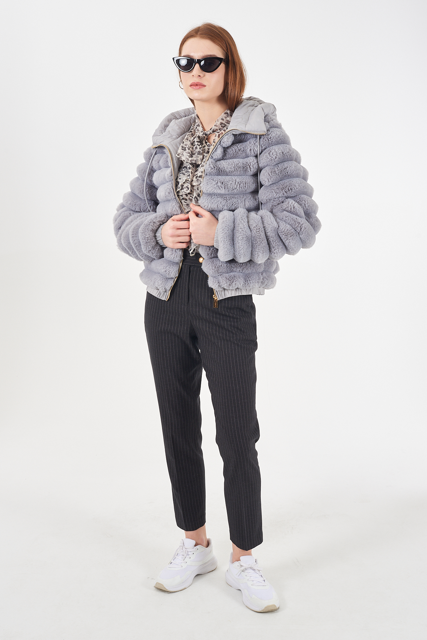* Giacca imbottita.* Cappuccio con coulisse.* Chiusura con zip a contrasto.* Tessuto pelliccia a righe.* Maniche lunghe con polsini elastici.* Orlo elastico.