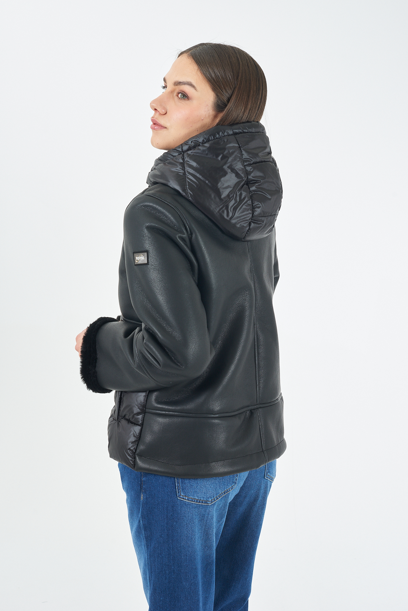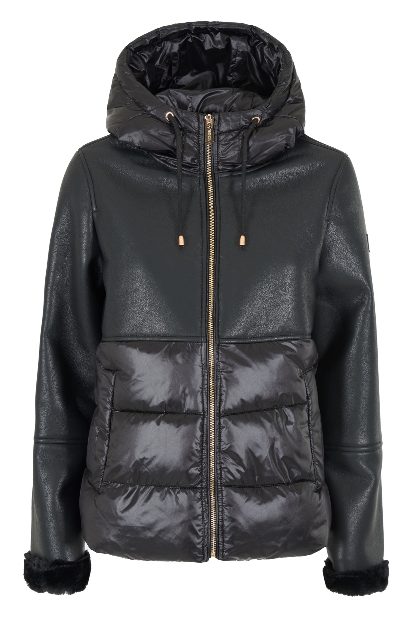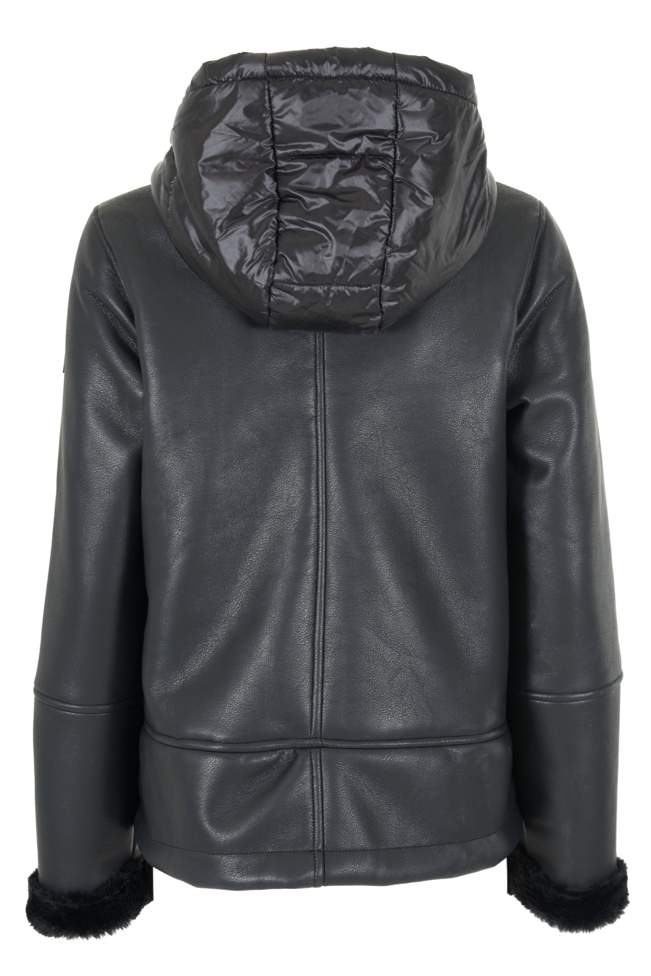* Giacca imbottita con maniche e carré in similpelle.* Cappuccio con coulisse e dettagli metallici.* Chiusura a zip con tiretto logato.* Tasche a filetto.* Polsini con finitura in eco-pelliccia.* Orlo dritto.