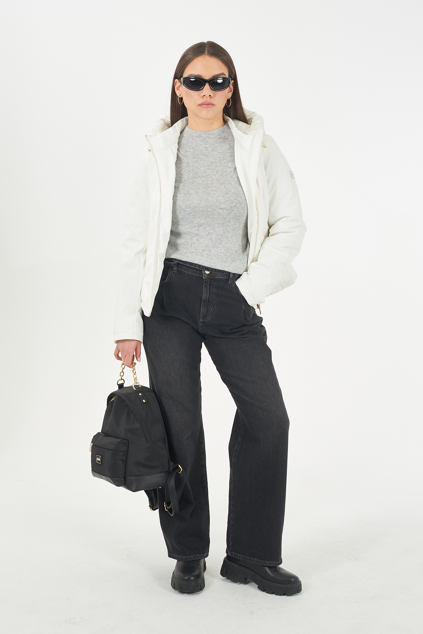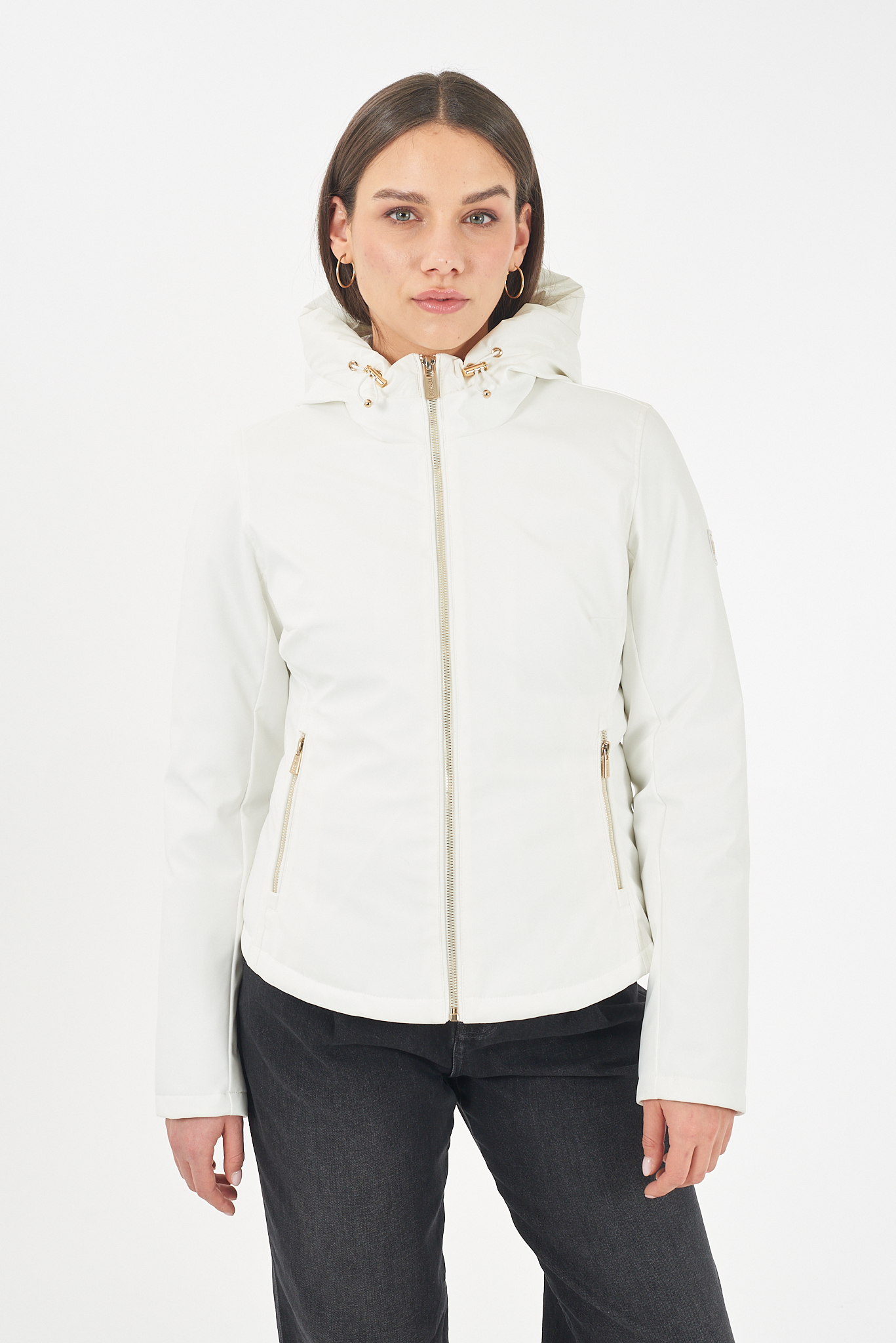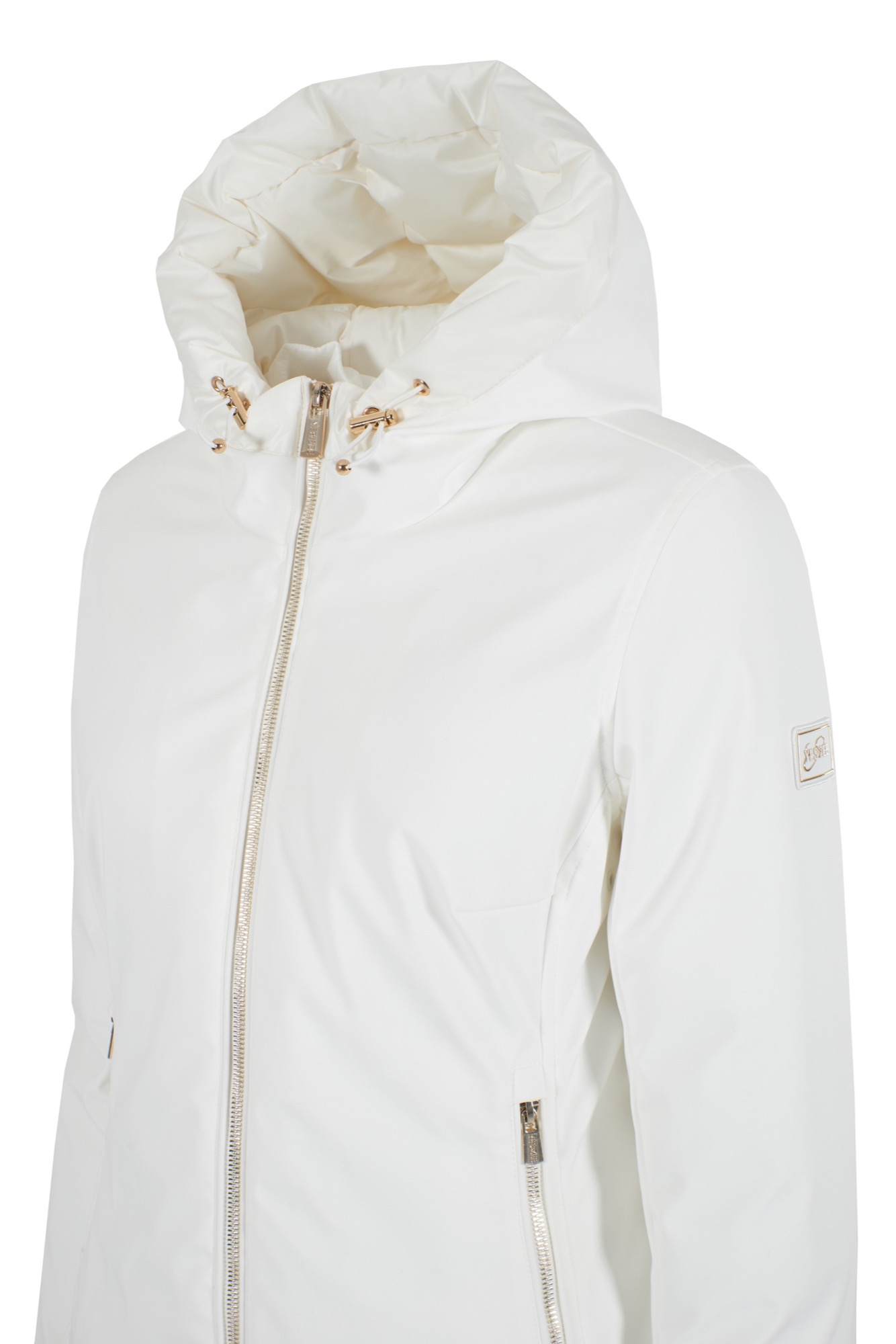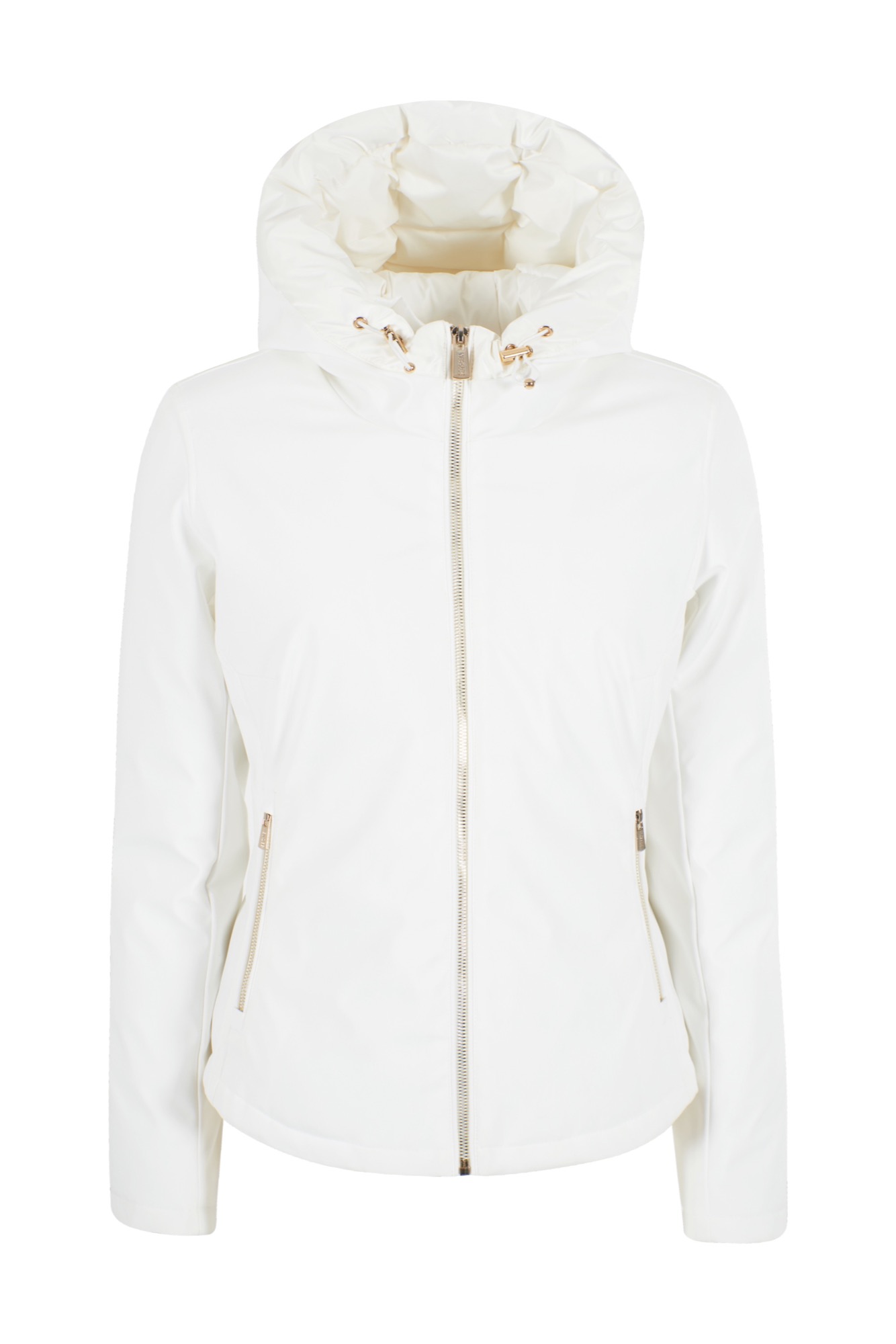 * Giubbotto con cappuccio imbottito e coulisse con terminali metallici.* Chiusura a zip con tiretto logato.* Tasche laterali con zip a filetto.* Maniche lunghe con polsini elastici.* Orlo dritto.