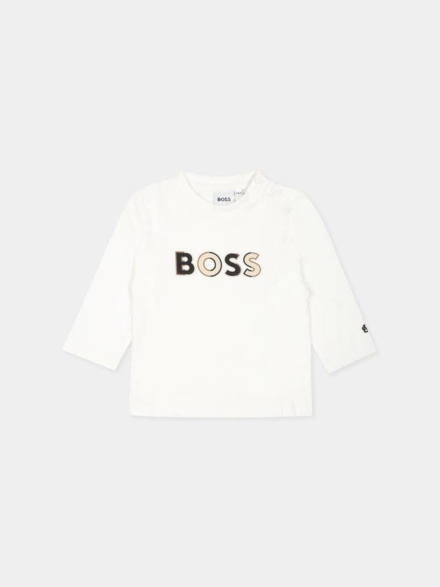T-shirt bianca in cotone organico, a maniche lunghe, con girocollo a costine e chiusura con bottoni automatici sulla spalla. È decorata con stampa logo sul davanti e doppia B sulla manica.