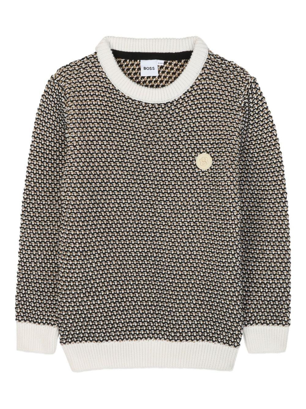 Maglione in cotone bianca/nera per bambino di Boss Kids. Maglia fantasia tricolore Dadge in silicone doppia B sul petto