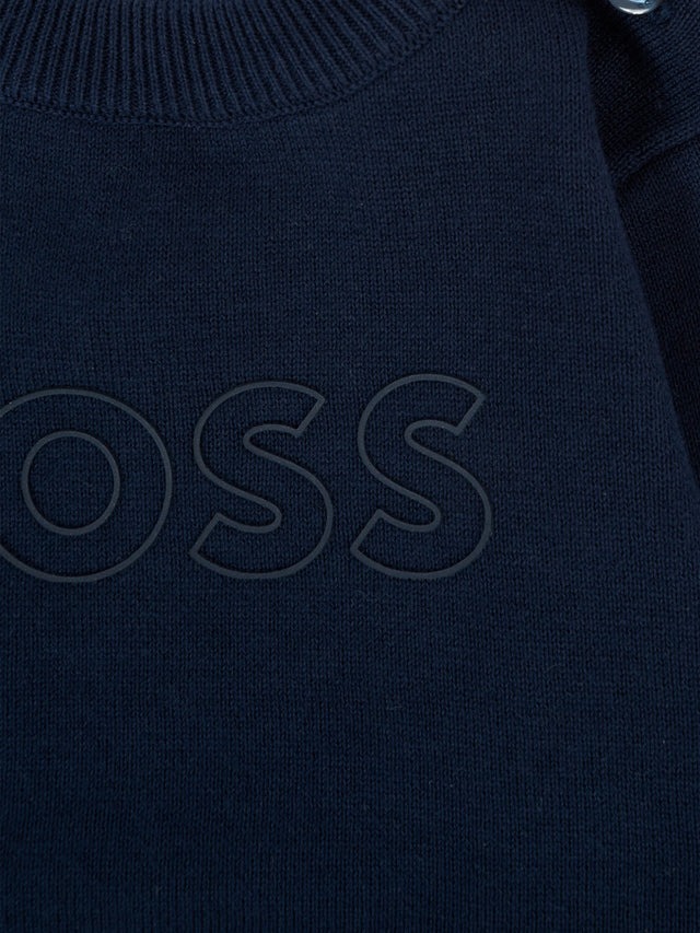 Maglione blu realizzato in cotone, con maniche lunghe, girocollo, orlo e polsini a costine e chiusura con bottoni sulla spalla. È decorato con logo gommato sulla parte anteriore.