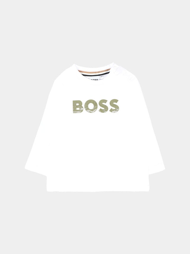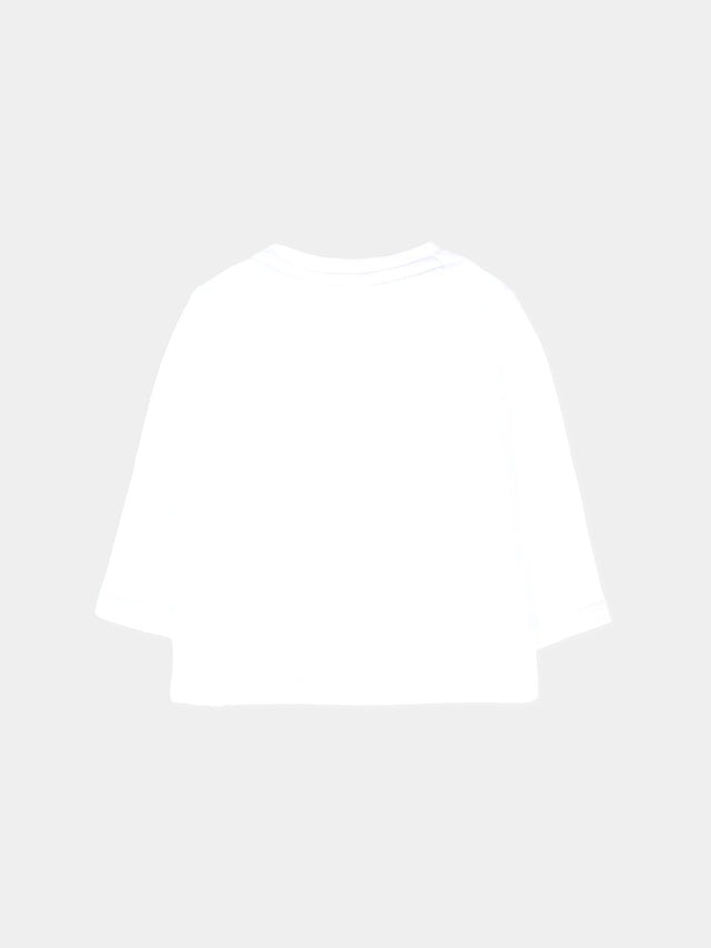 T-shirt bianca in cotone, a maniche lunghe, con girocollo a costine e chiusura con bottoni automatici sulla spalla. È decorata con logo verde gommato sulla parte anteriore.