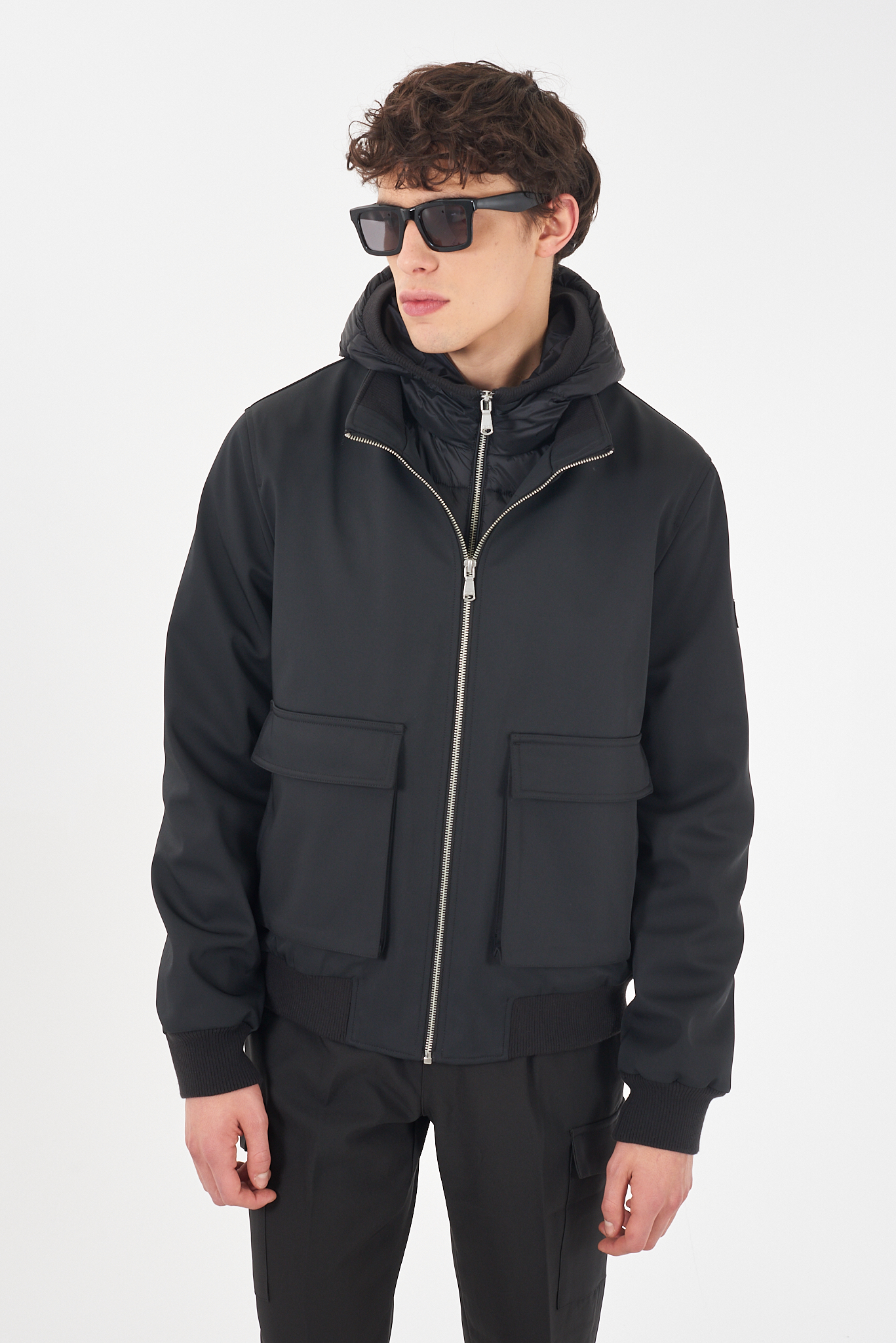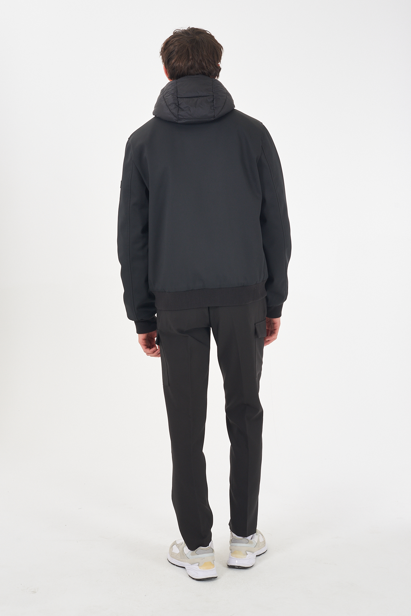 * Bomber imbottito.* Cappuccio in tessuto a contrasto.* Chiusura a zip.* Tasche frontali con patta e bottone a pressione.* Tasche laterali a filetto.* Maniche lunghe con polsini elastici.* Orlo elastico.