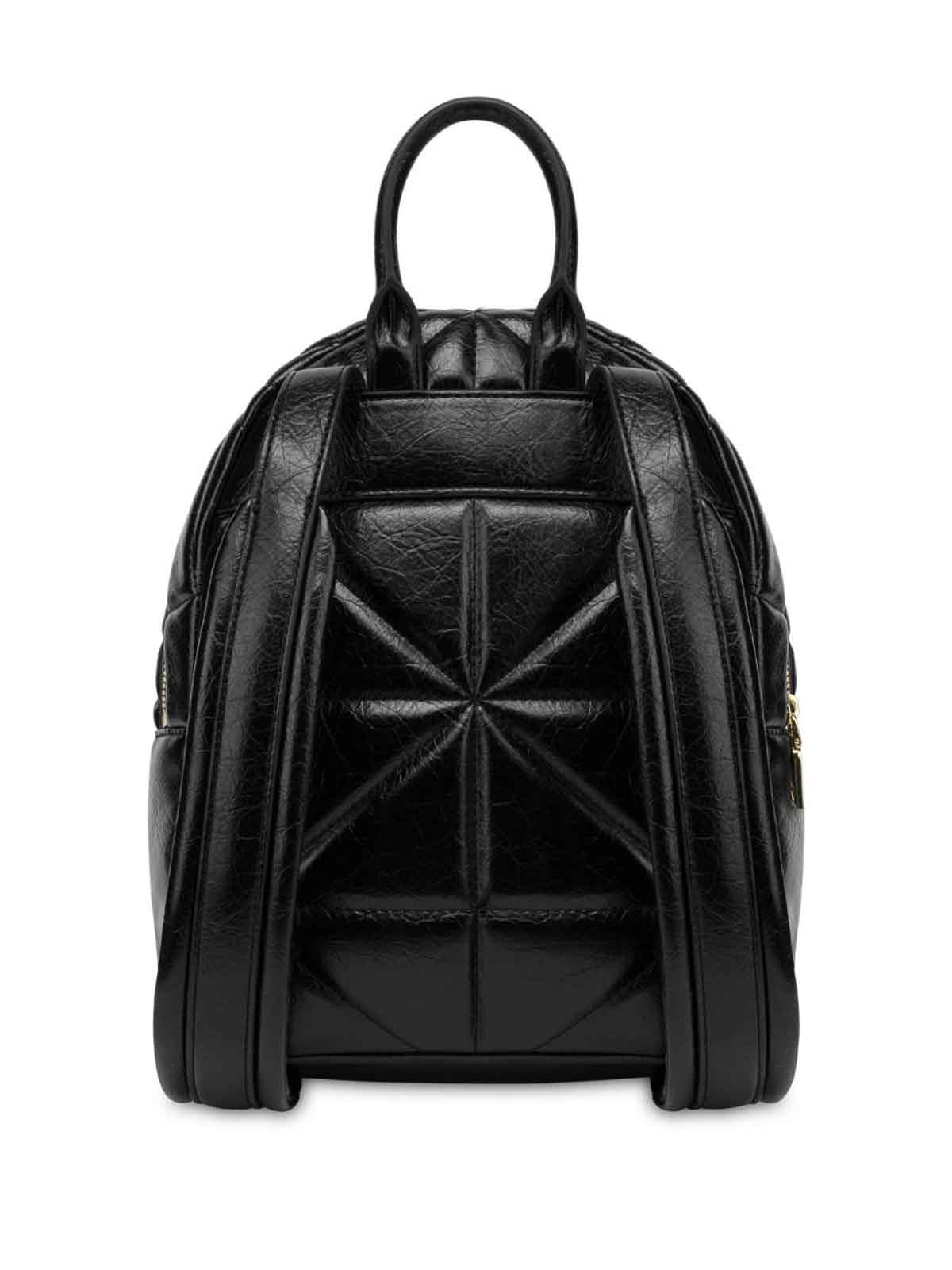 Zaino sintetico nero di love moschino design trapuntato applicazione logo catena tubolare due spallacci regolabili scomparto superiore con zip zip, hardware tono, love moschino, sintetico, nero, catena, design trapuntato, donna
