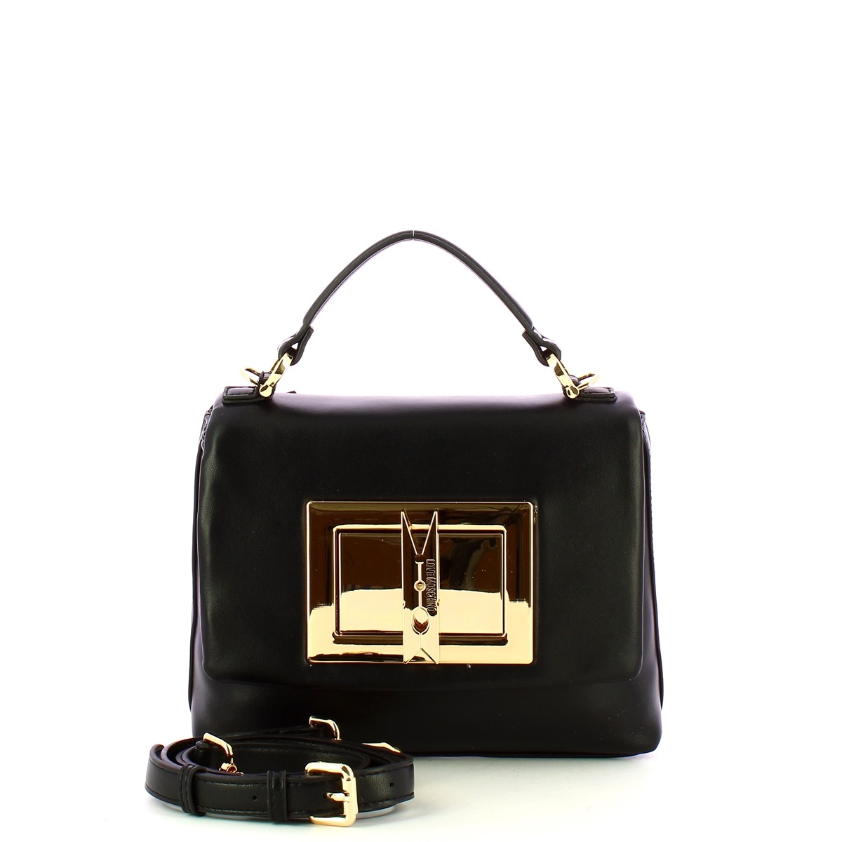 Borsetta a mano Clothespin Nero Love Moschino, modello pratico e alla moda, con manico singolo e tracolla regolabile rimovibile. Chiusura con patta e girello a forma di molletta in metallo. Interno foderato con scomparto con cerniera.