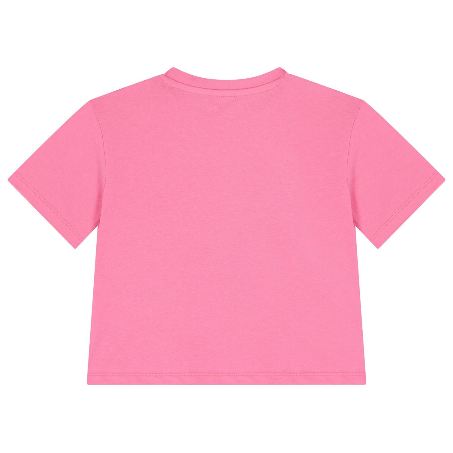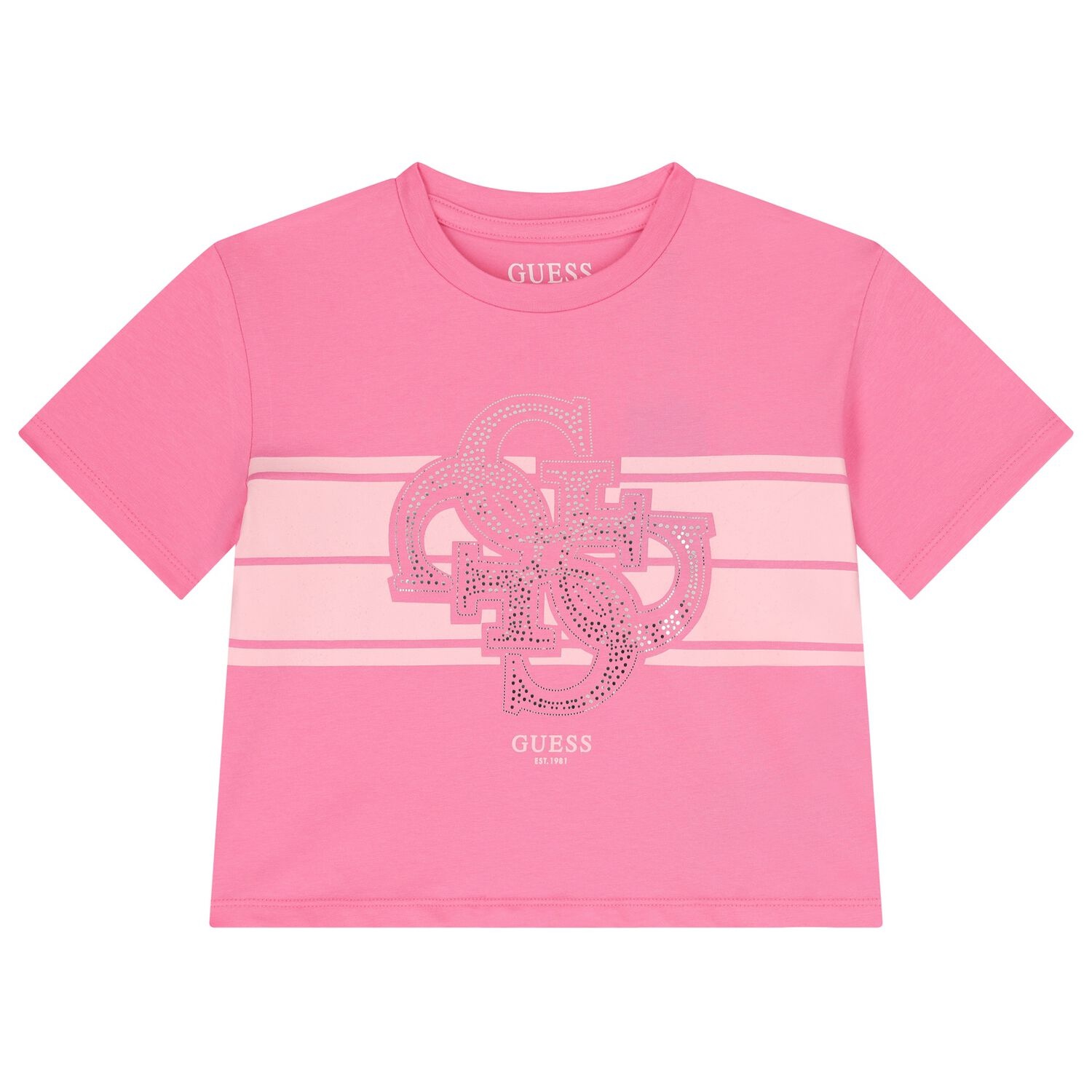 T-shirt rosa per bambine di Guess. Realizzata in morbido jersey di cotone, presenta il logo 4G del marchio impreziosito da borchie argentate scintillanti sul davanti.