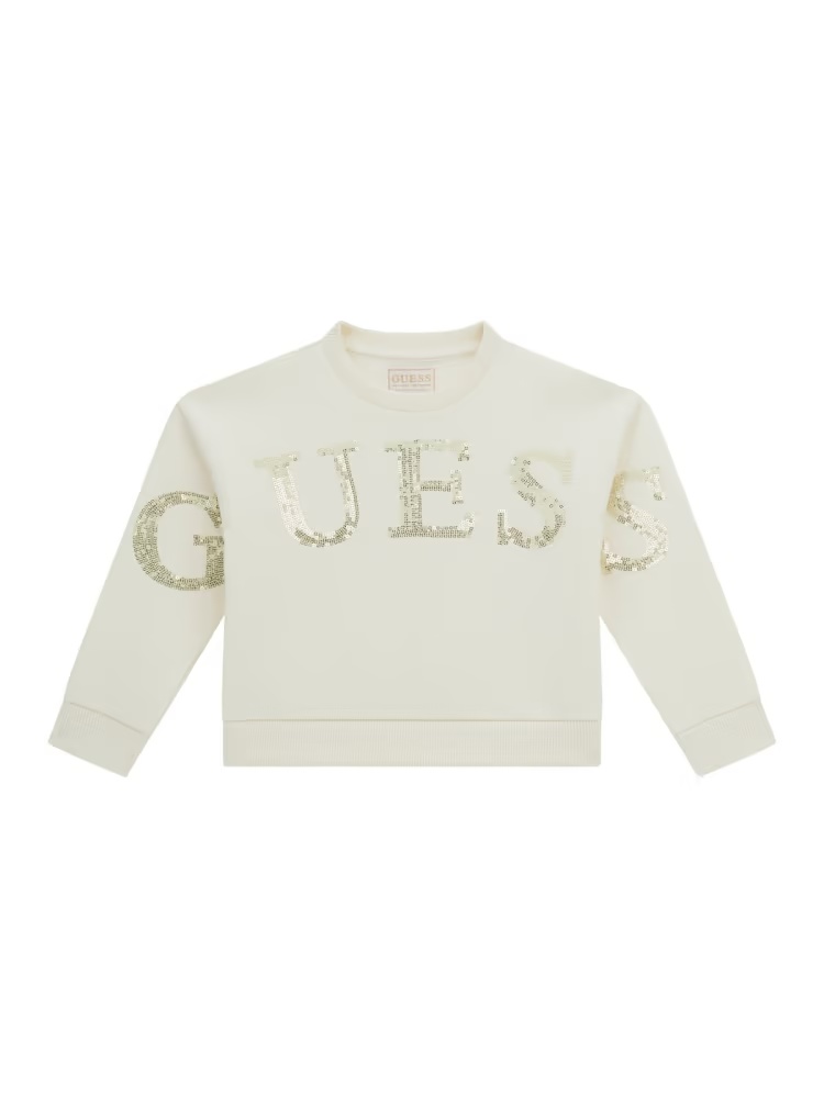 Felpa Guess da bambina logo con paillettes , realizzata in cotone felpato. Questa felpa Guess girocollo ha le maniche lunghe, il maxi logo Guess sul davanti con paillettes, polsini e fondo elasticizzati.