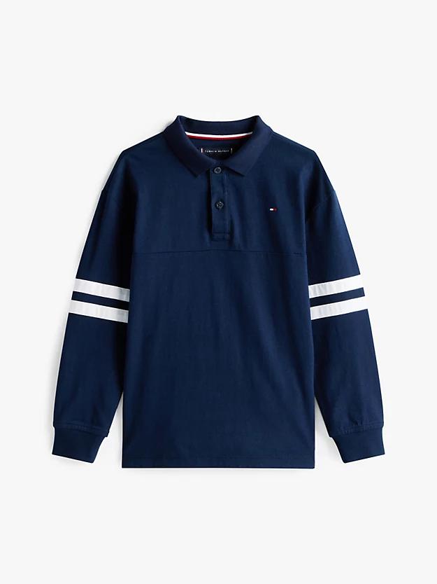 La polo a maniche lunghe è ravvivata dai dettagli a righe sportivi, mentre il mix di loghi sul retro aggiunge un tocco di stile.
