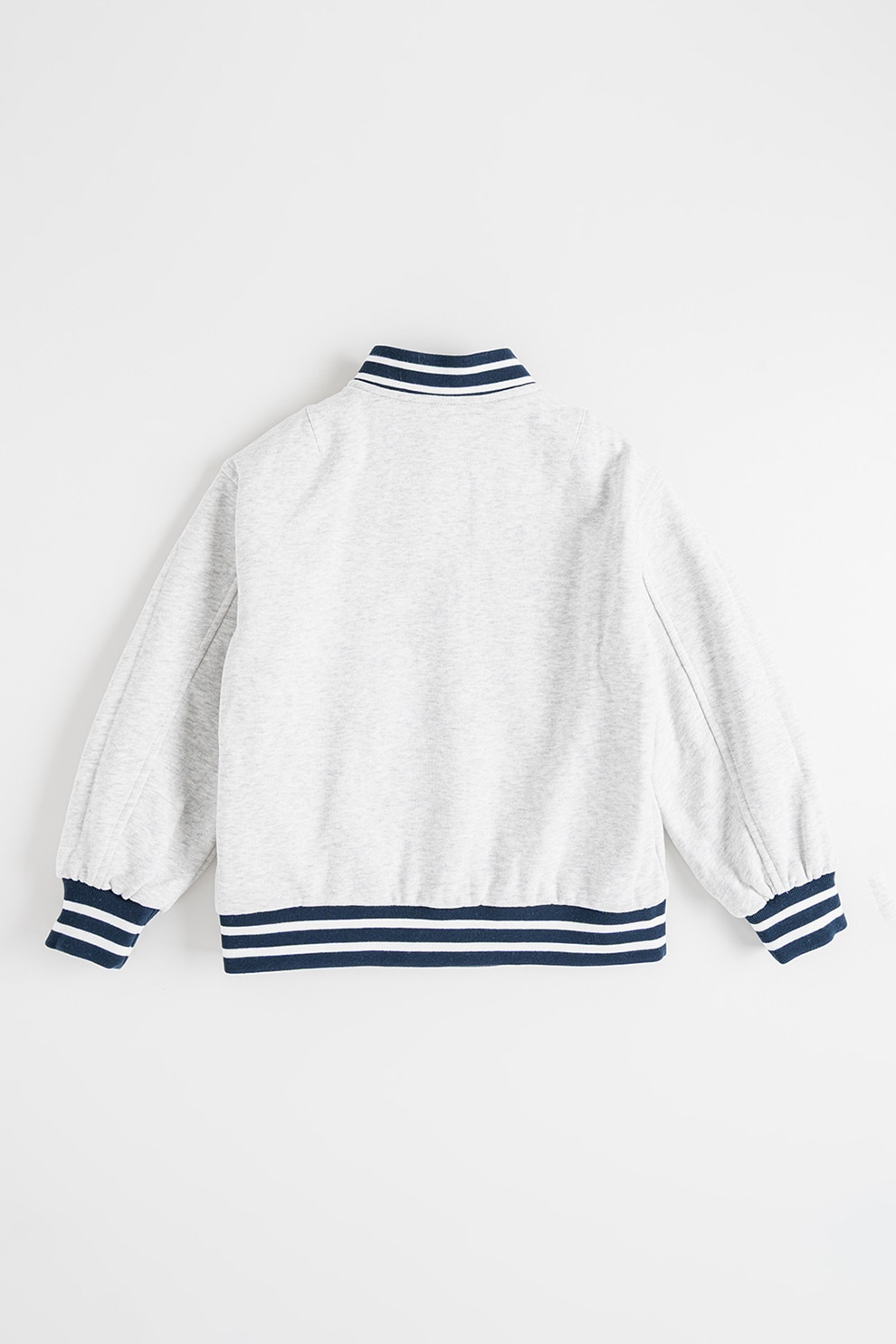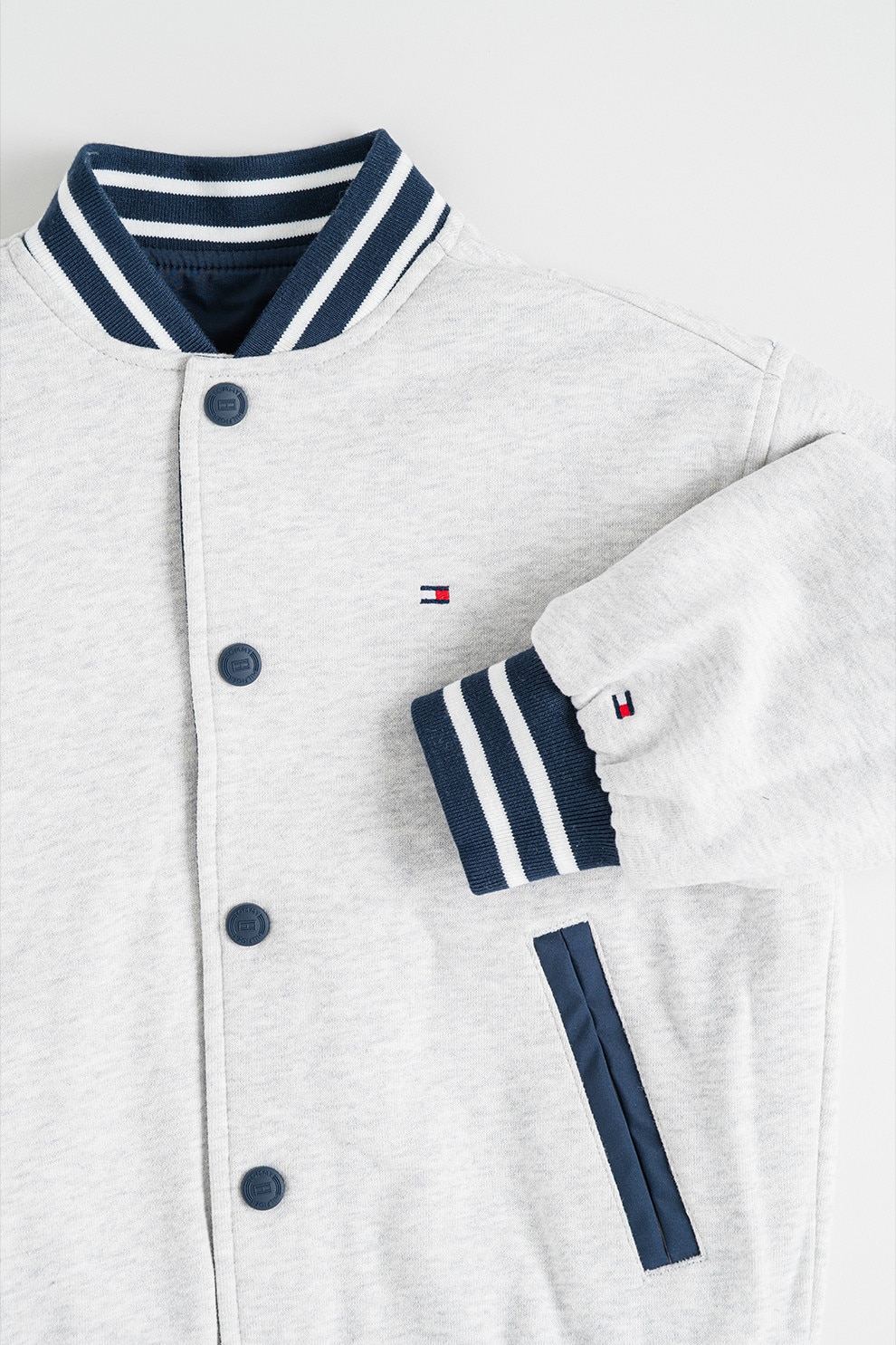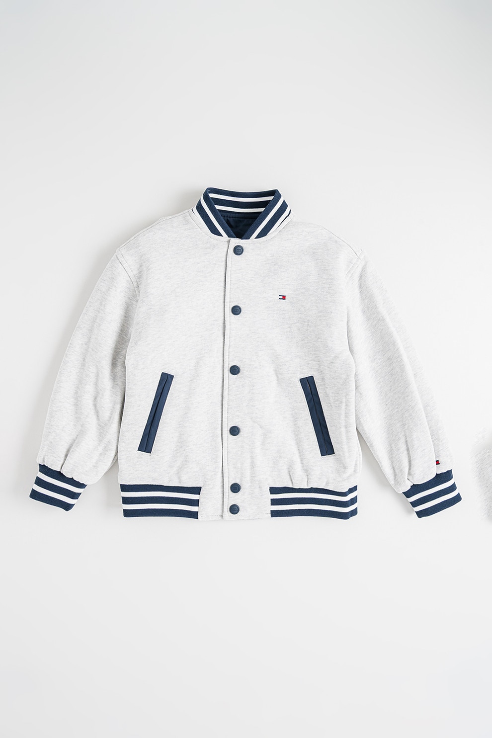 Il bomber reversibile, con i loghi d'ispirazione college a contrasto e il motivo a righe sulle finiture a coste, è un concentrato di stile sportivo.