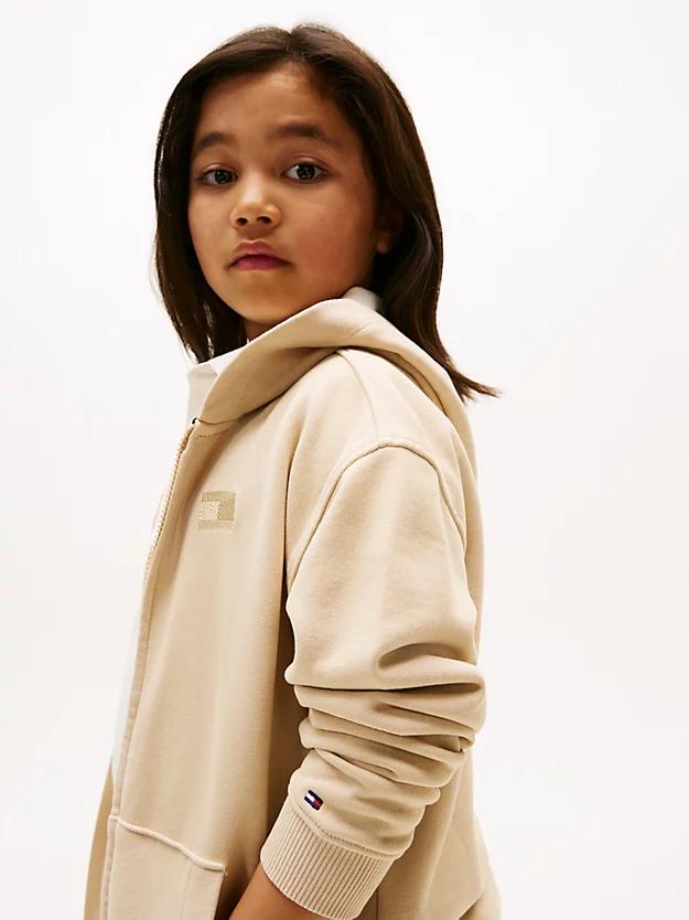 Aggiungi un tocco di eleganza ai look casual grazie alla felpa in puro cotone con cappuccio e zip integrale, impreziosita dalla bandierina tono su tono ricamata sul petto.