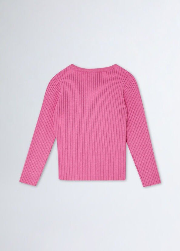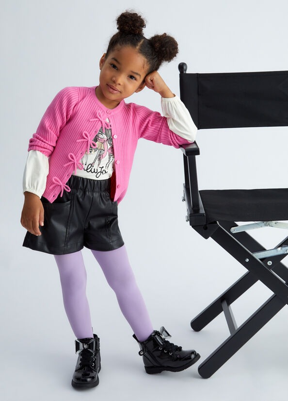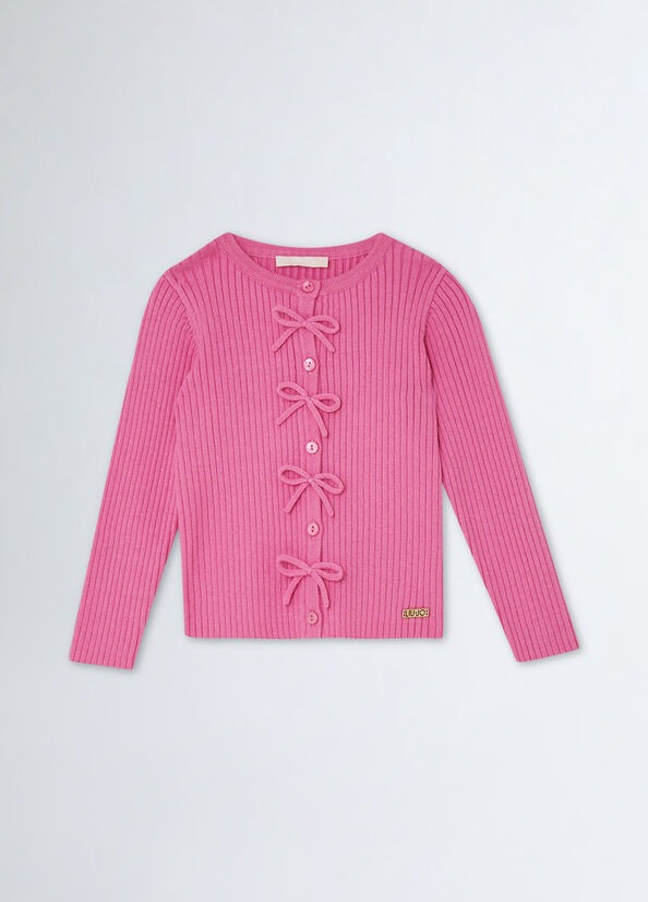 Cardigan in maglia di misto viscosaLavorazione a costineFiocchetti sul davantiTaglio girocolloManiche lungheLogo in metallo al fondoChiusura con bottoni