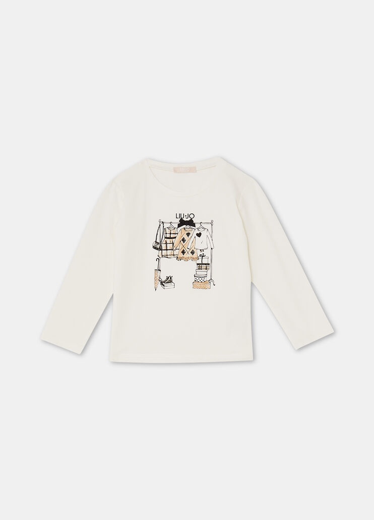 T-shirt in jersey di cotone stretchStampa grafica con strass sul davantiTaglio girocolloManiche lunghe