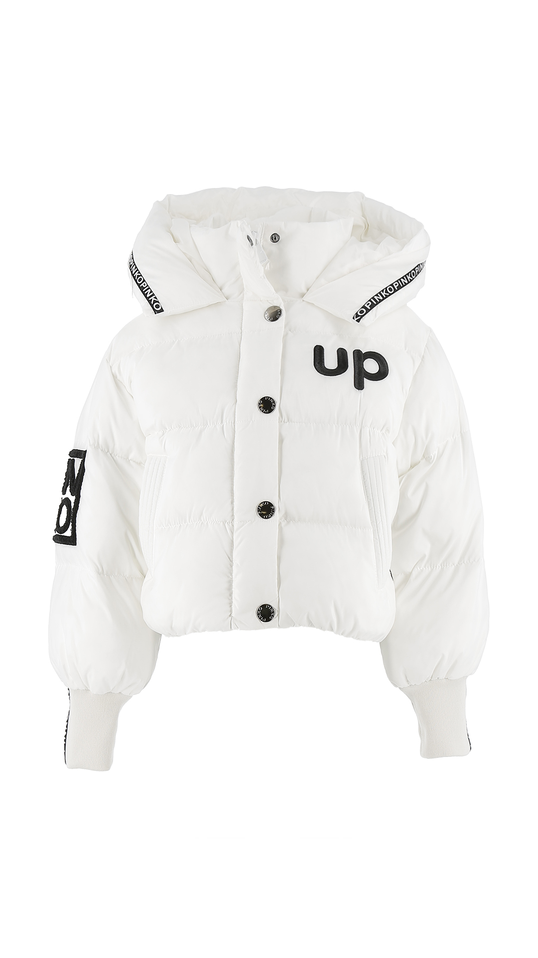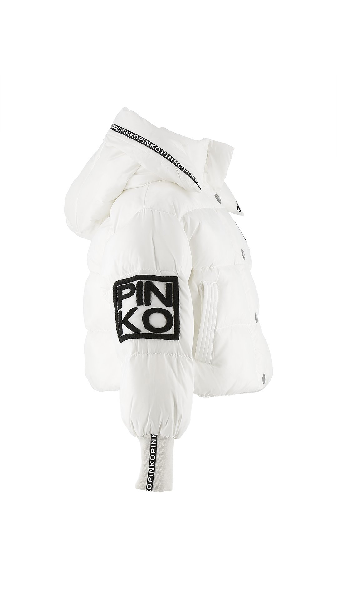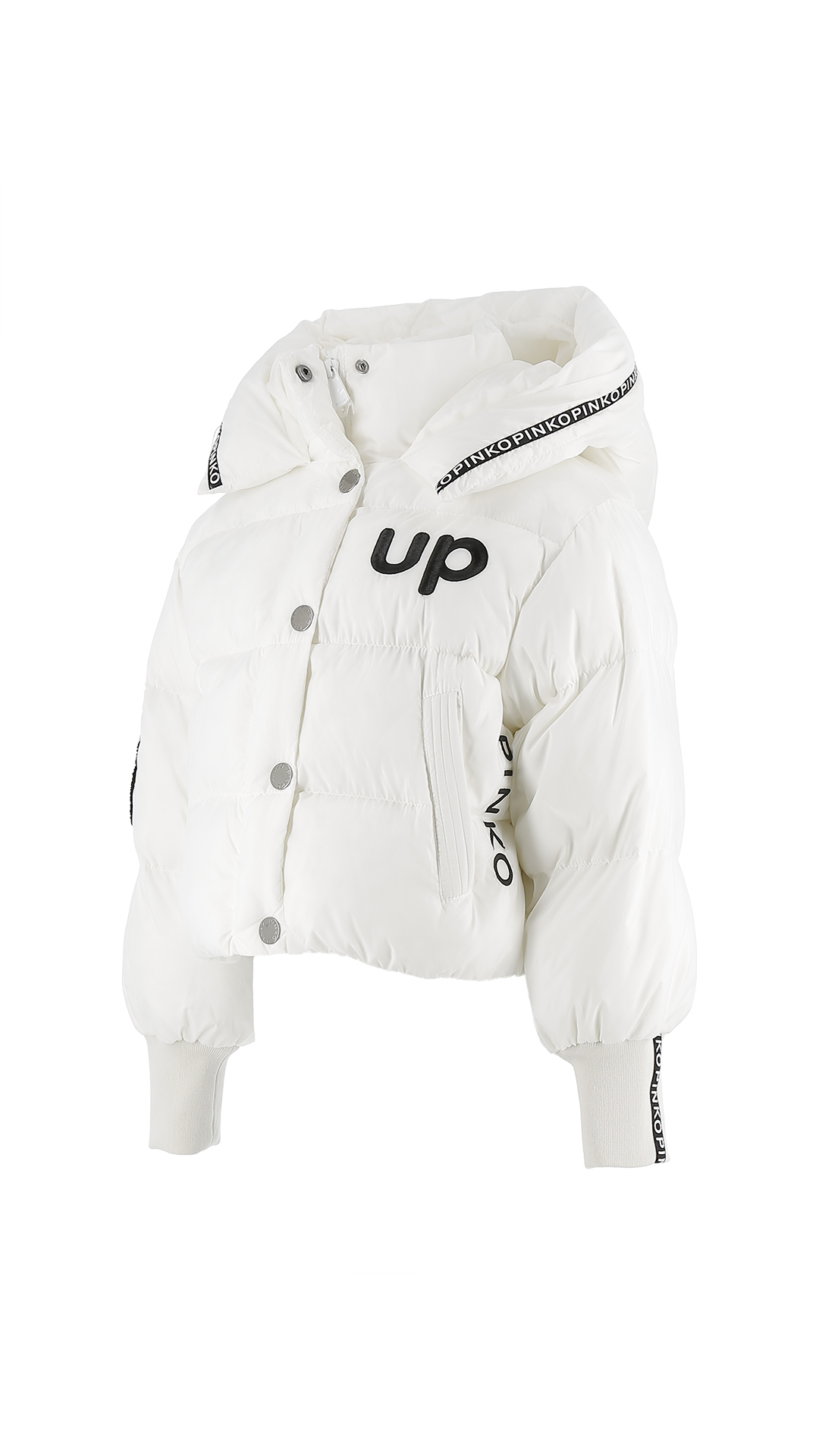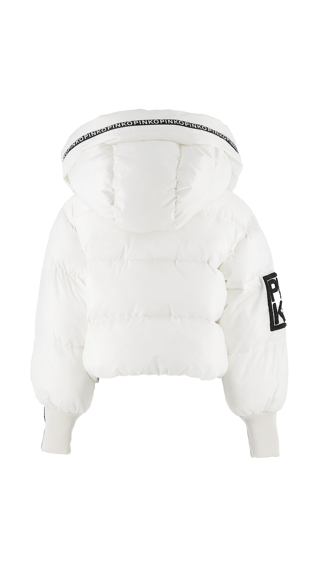 Giubbotto imbottito con cappuccio e loghi a contrasto.