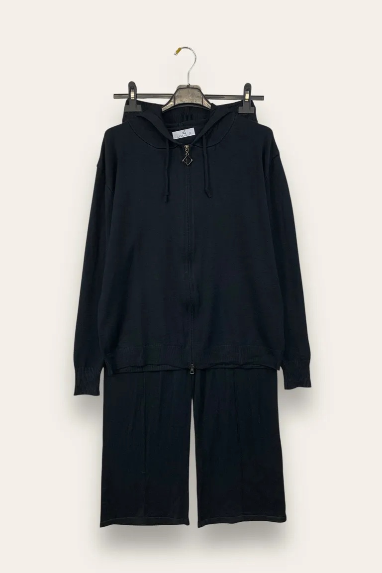 Completo in maglia, felpa con zip e cappuccio e pantalone a palazzo