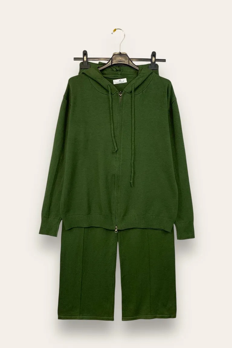 Completo in maglia, felpa con zip e cappuccio e pantalone a palazzo