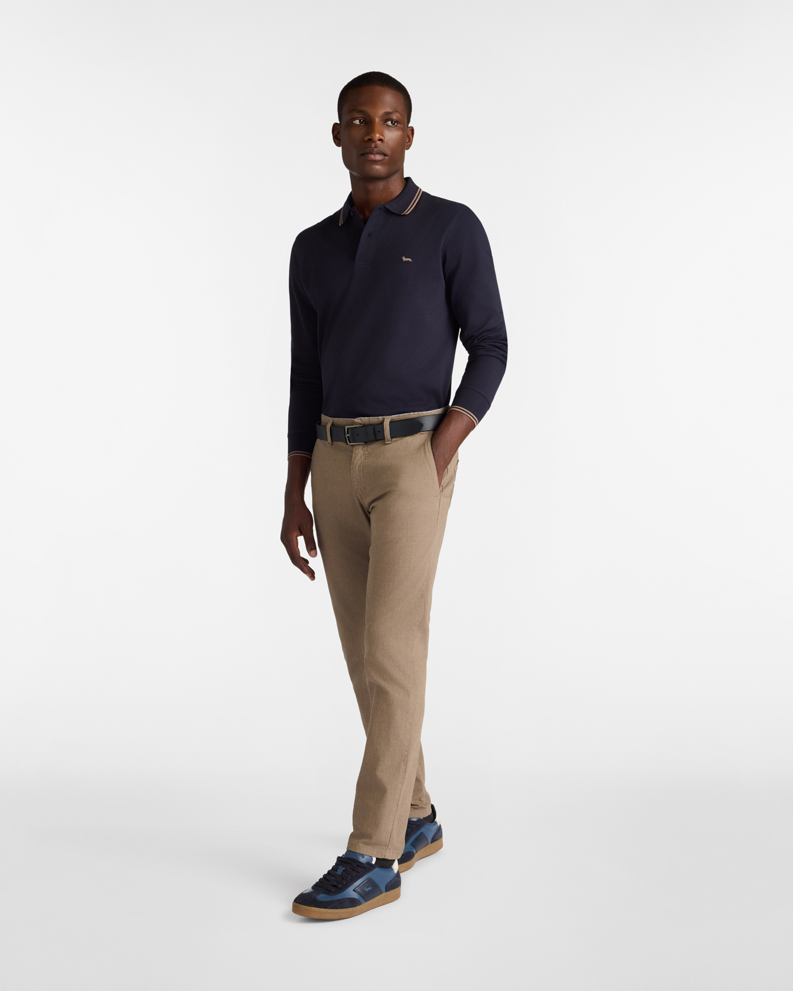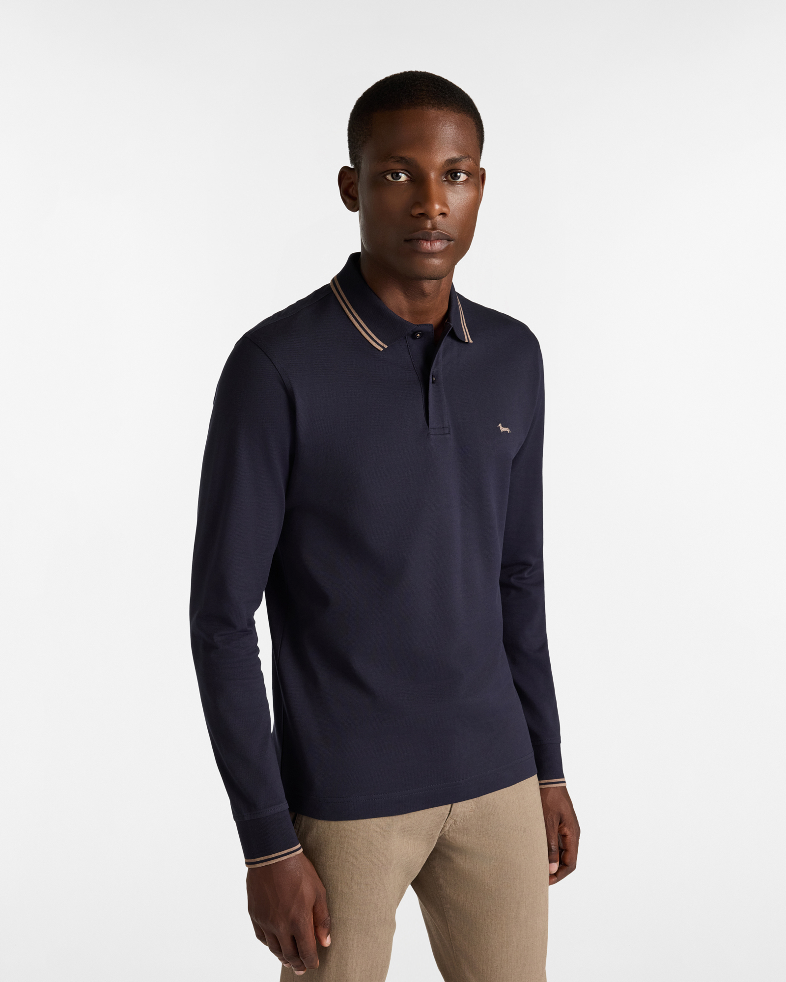 Harmont & Blaine presenta una polo da uomo a maniche lunghe estremamente versatile realizzata in piquet di 100% cotone mercerizzato e proposta in una vestibilità narrow, un fit leggermente più aderente. La polo è impreziosita da sottili righe a contrasto, situate in corrispondenza dell’estremità del collo e del fondo manica, ed è rifinita dall'immancabile bassotto Blaine ricamato sul petto nella stessa tonalità delle righe.