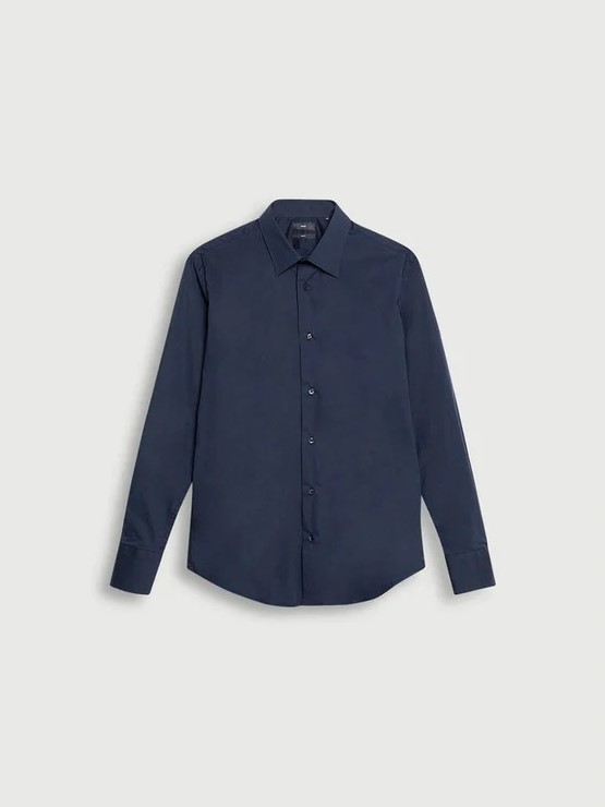- Camicia blu scuro slim fit- Filati in puro cotone- Colletto italiano con stecche removibili- Bottoni logati