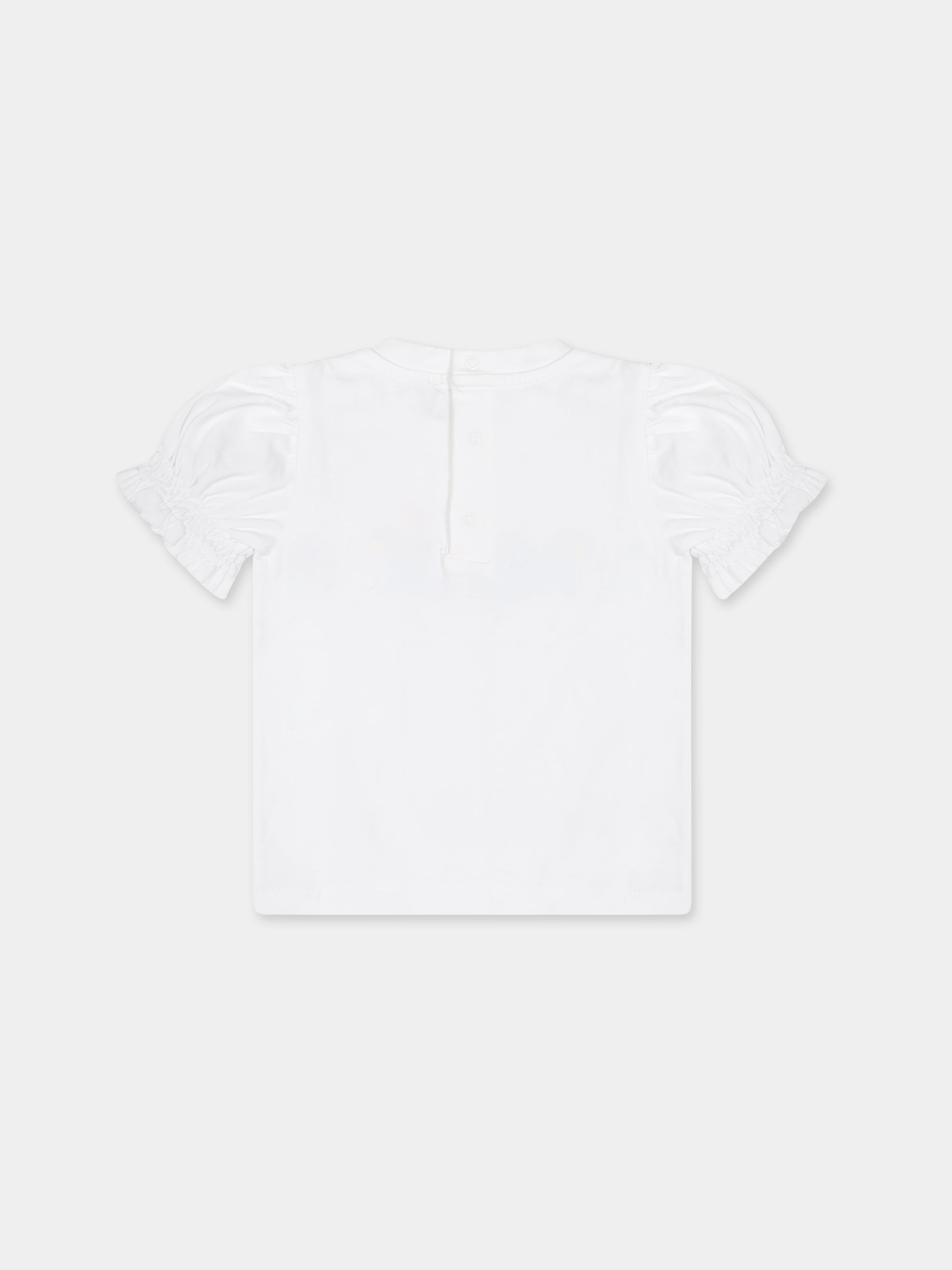 T-shirt bianca in jersey di cotone, con maniche corte a palloncino, girocollo a costine e chiusura con bottoni automatici sul retro. È decorata con logo celeste e fiori, sulla parte anteriore.