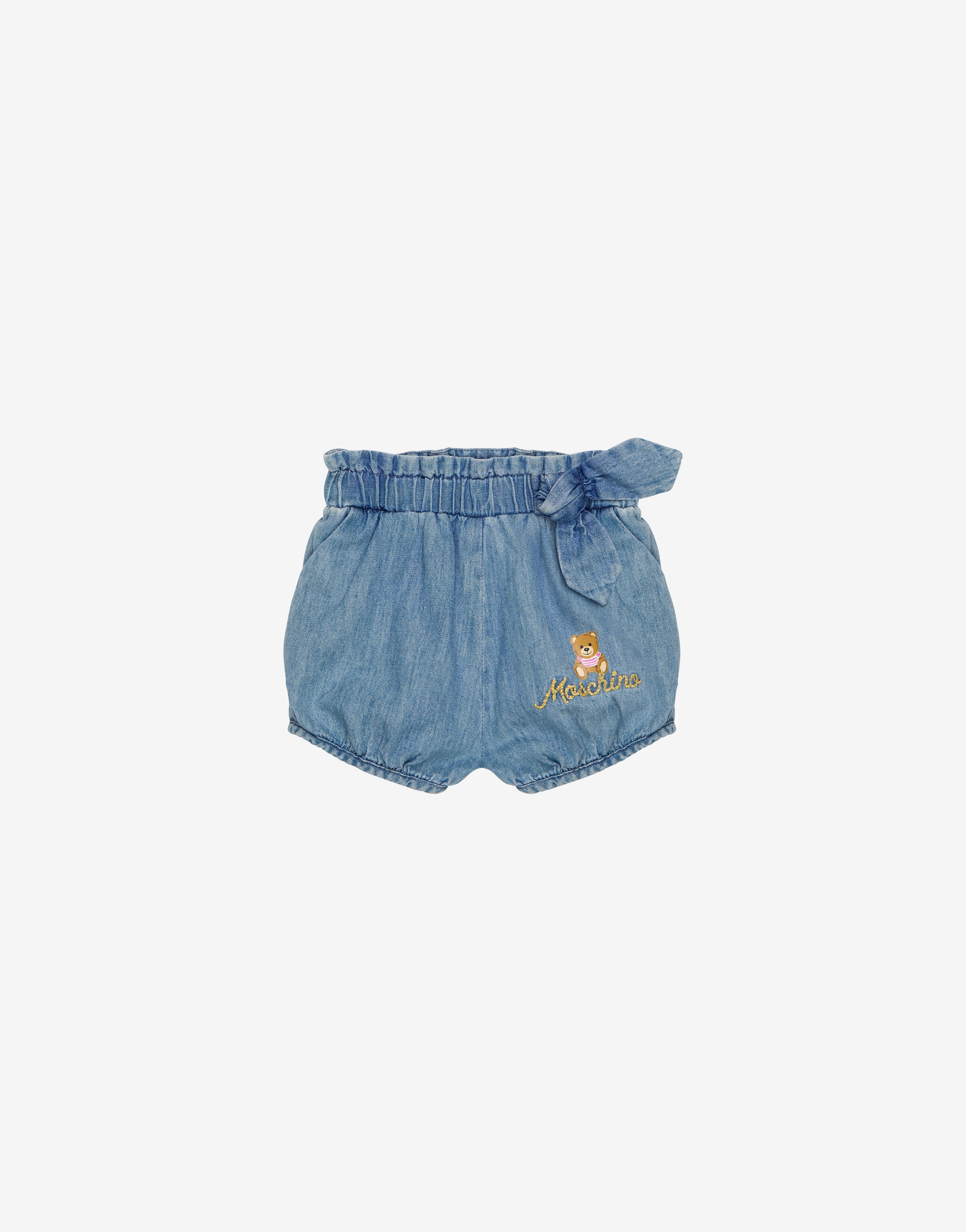Chambray di cotone effetto denimStampa Moschino Teddy Bear sul davantiRicamo logo doratoCoulisse in vita allacciata a fiocco sul davantiEffetto palloncino