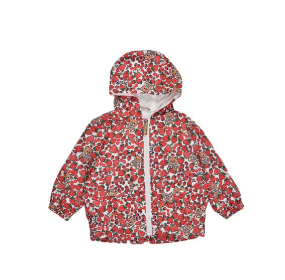Giubbino in nylon fondo bianco con stampa Moschino Teddy fruit fragola e ciliegia all over, modello con cappuccio a manica lunga con due tasche frontali e interno in cotone. Il capo presenta chiusura con cerniera.