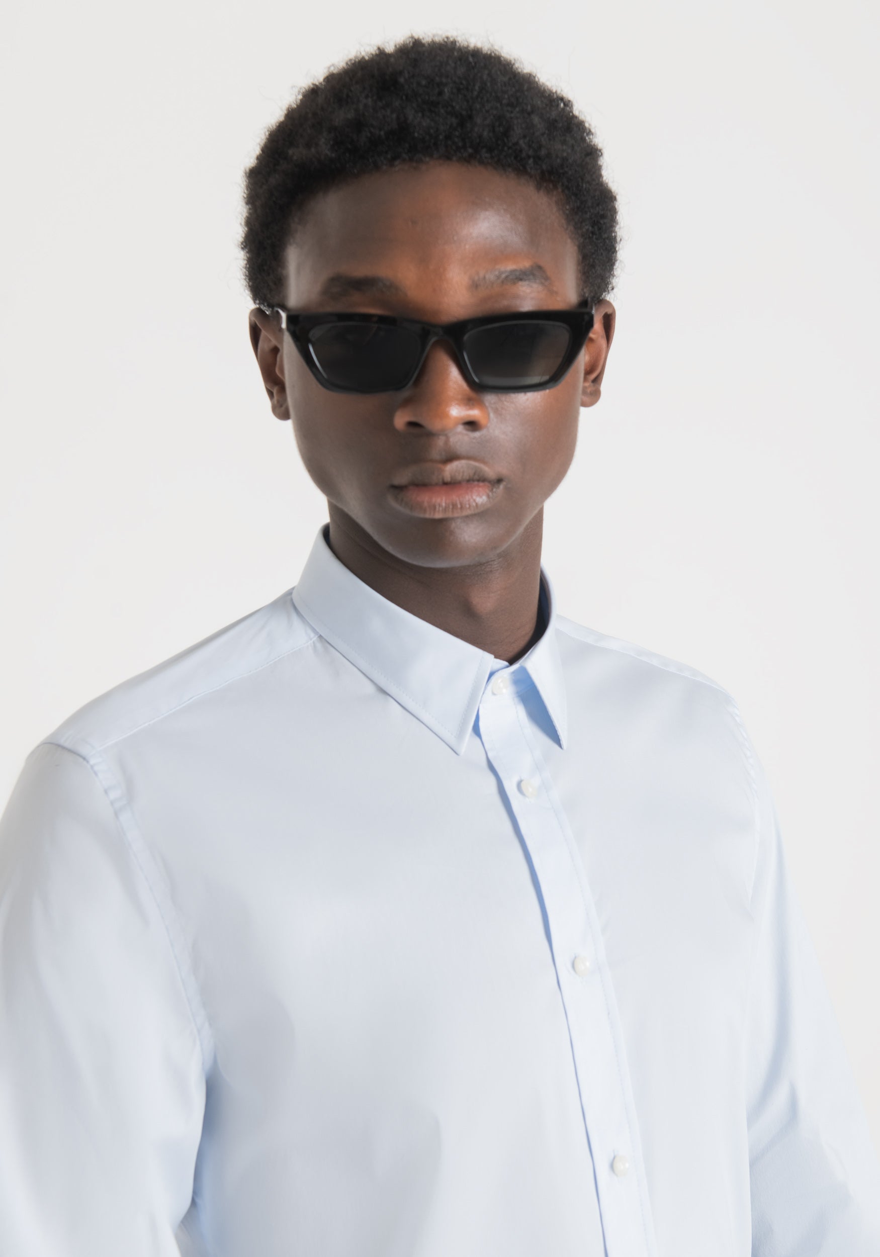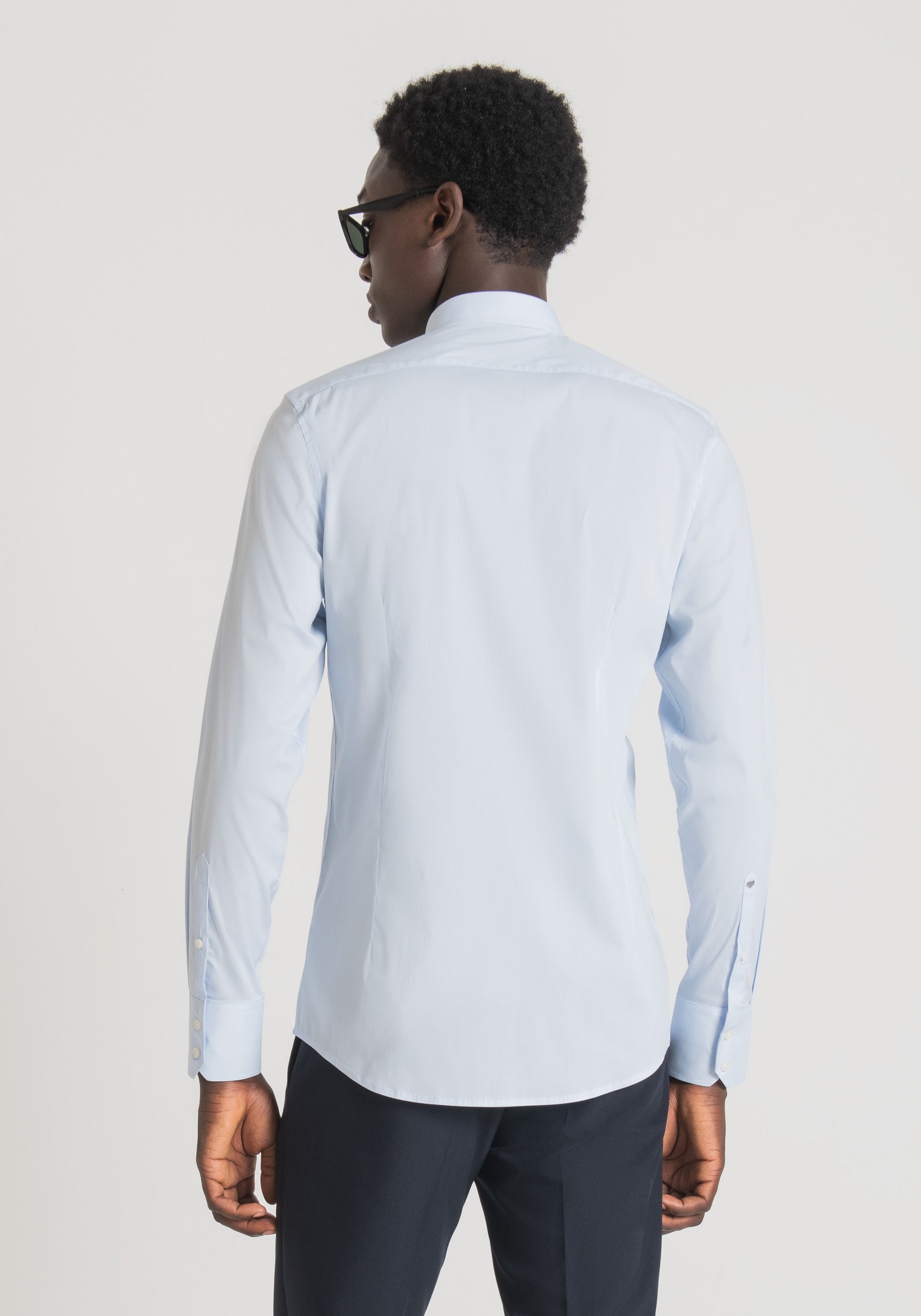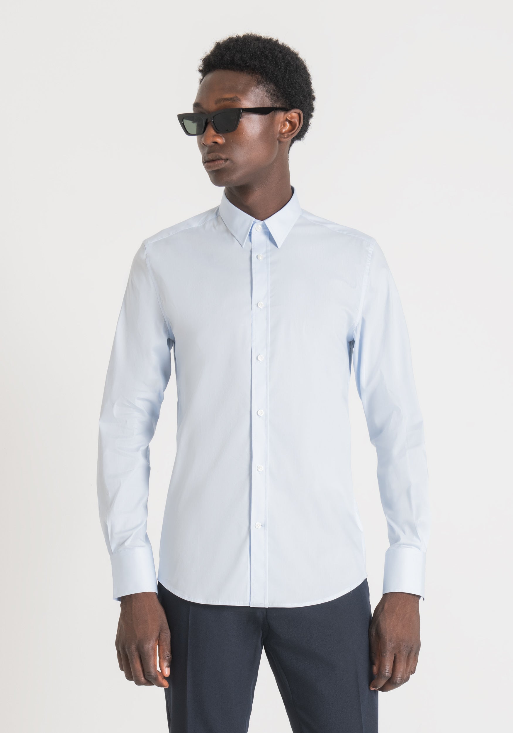 * Camicia a maniche lunghe* Chiusura con bottoni frontali* Colletto classico* Polsini con bottone* Linea elegante e aderente* Tessuto liscio e leggero