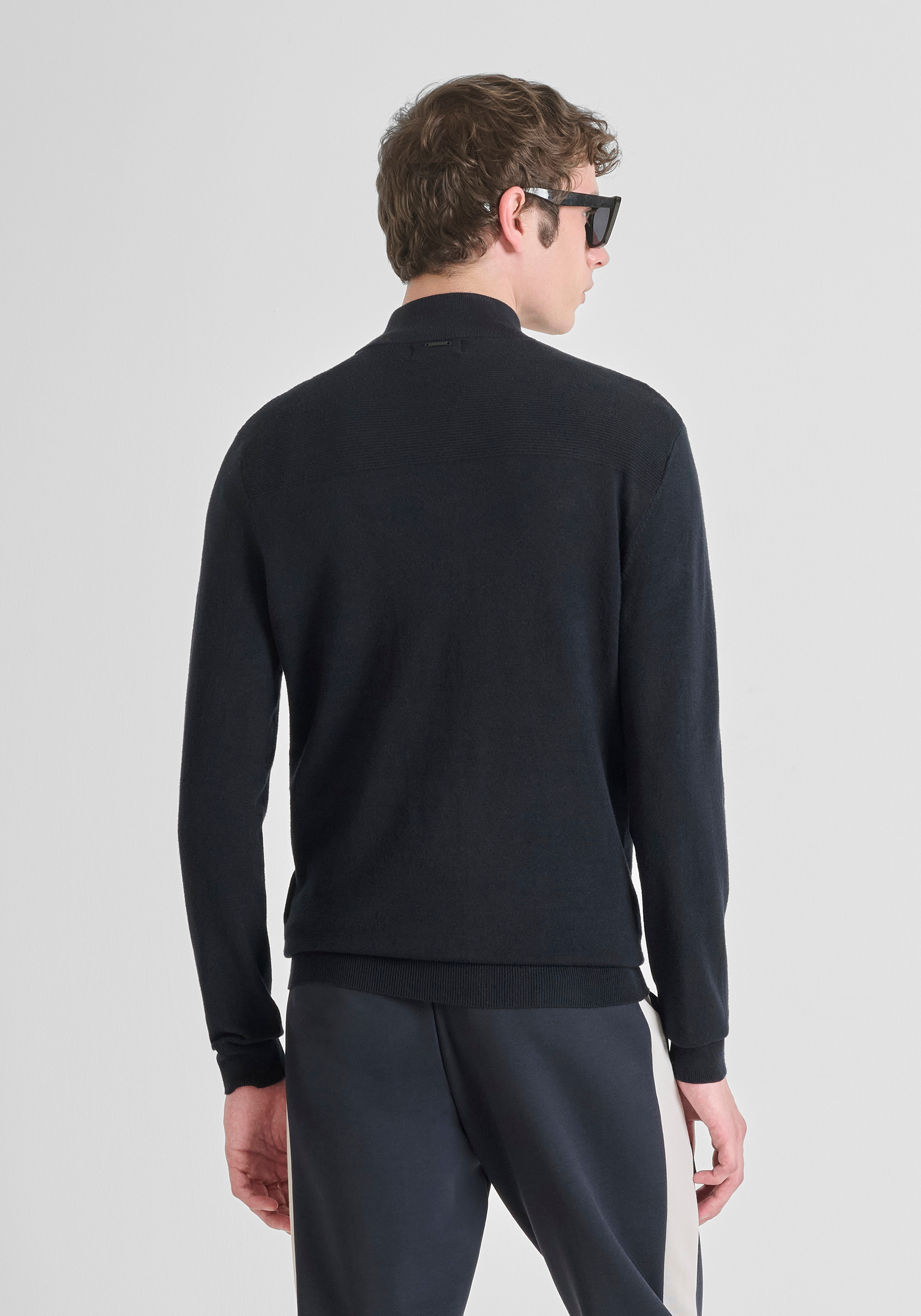 Maglia con chiusura zip dalla vestibilità slim, realizzata in moribido filato misto viscosa. Fondo e maniche in maglia elastica. Un modello intramontabile, perfetto per ogni occasione.