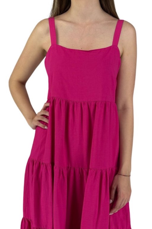 Markup abito lungo da donna realizzato in viscosa e lino a tinta unita. Senza maniche. Presenta scollo ampio, bretelle, allacciatura posteriore e gonna ampia con balze.