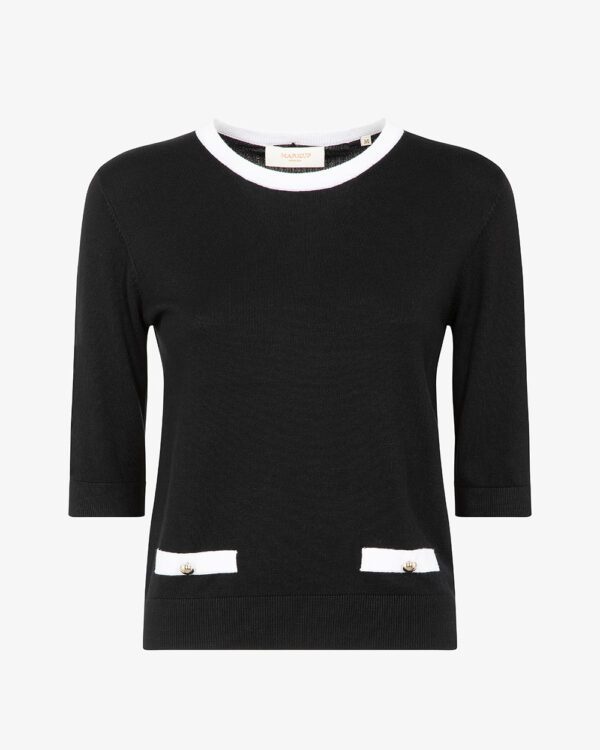 * Maglia da donna a maniche al gomito* Girocollo con bordo a contrasto* Dettagli decorativi con bottoni sul davanti* Fondo e maniche con lavorazione a costine* Stile elegante e raffinato