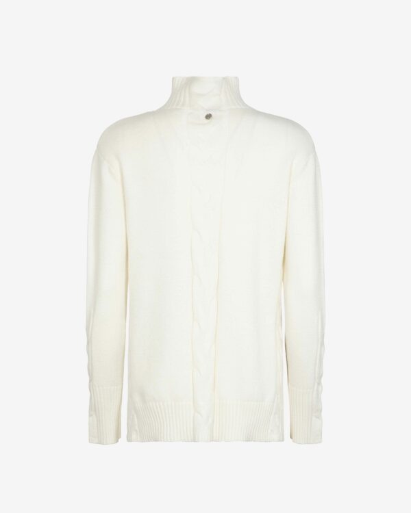* Maglione da donna a maniche lunghe* Collo alto a coste elasticizzate* Lavorazione a trecce sul davanti e sulle maniche* Fondo e polsini con bordo a costine* Stile morbido e raffinato