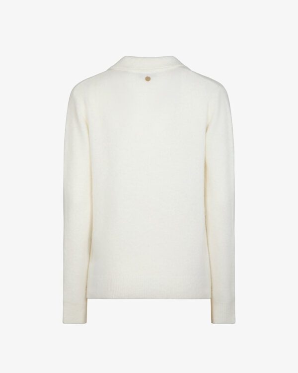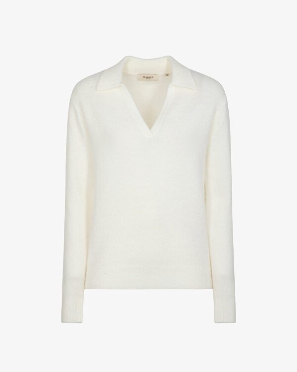 * Maglione da donna con colletto a punta* Scollo a V profondo e pulito* Maniche lunghe con finitura a costine* Fondo lavorato a maglia* Linea morbida e femminile