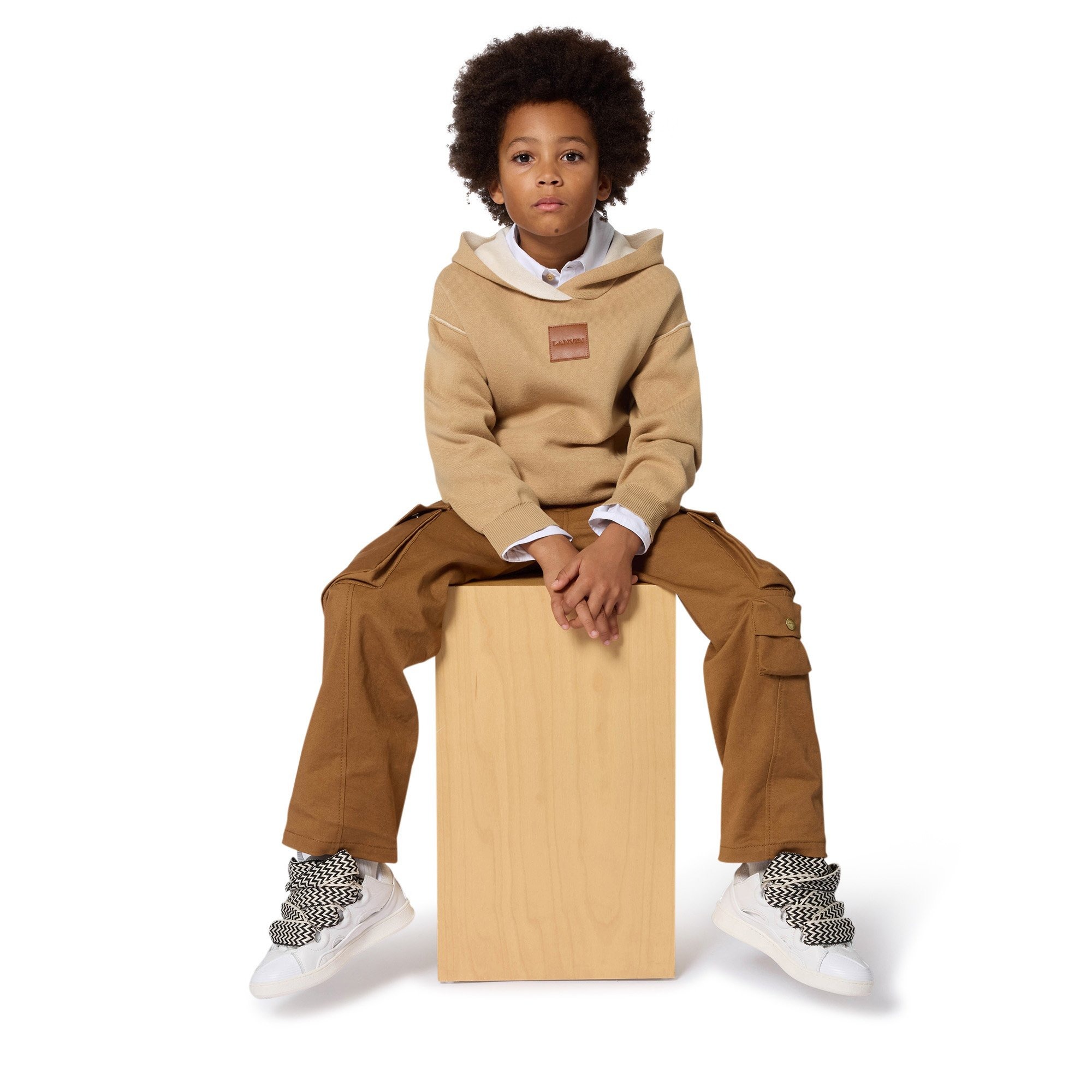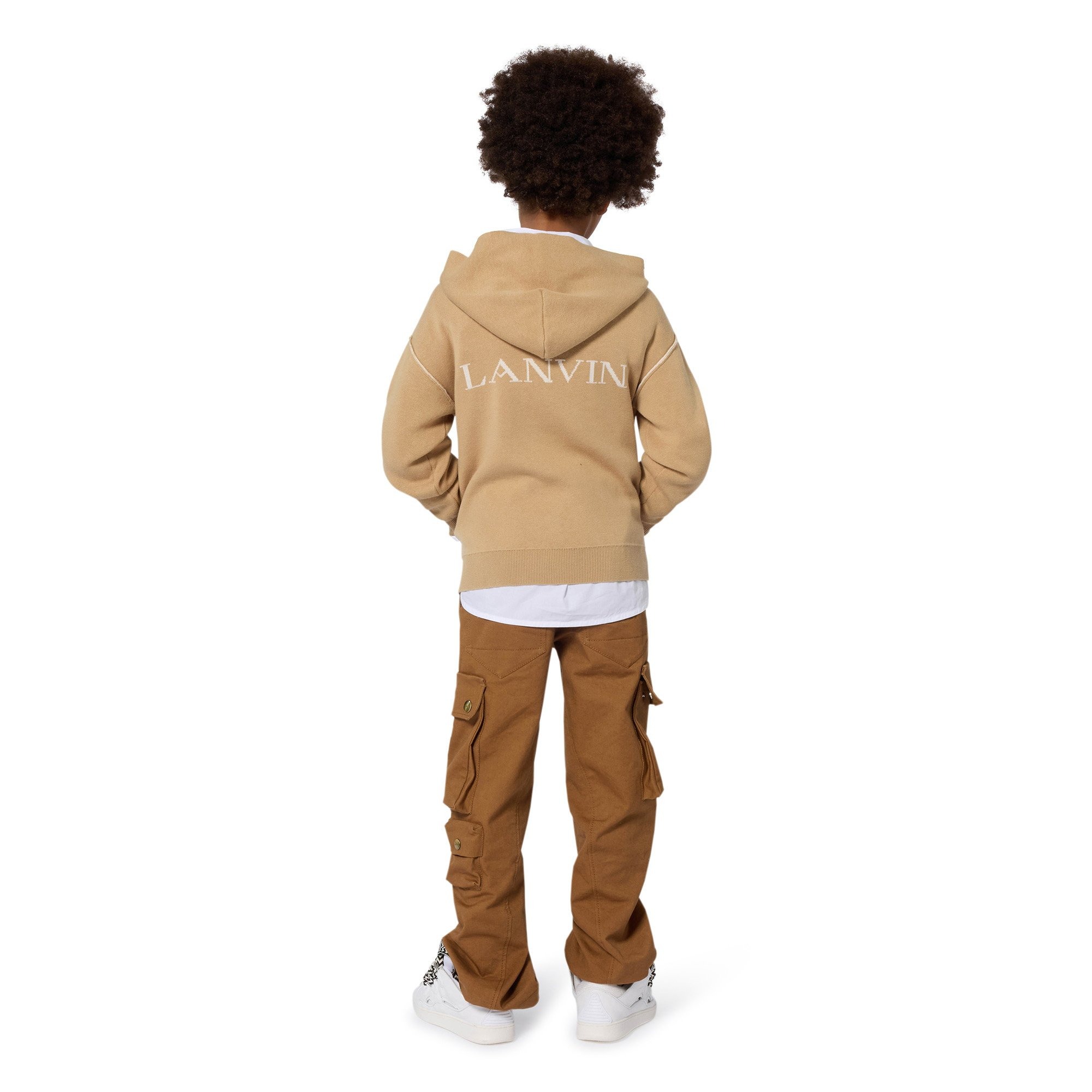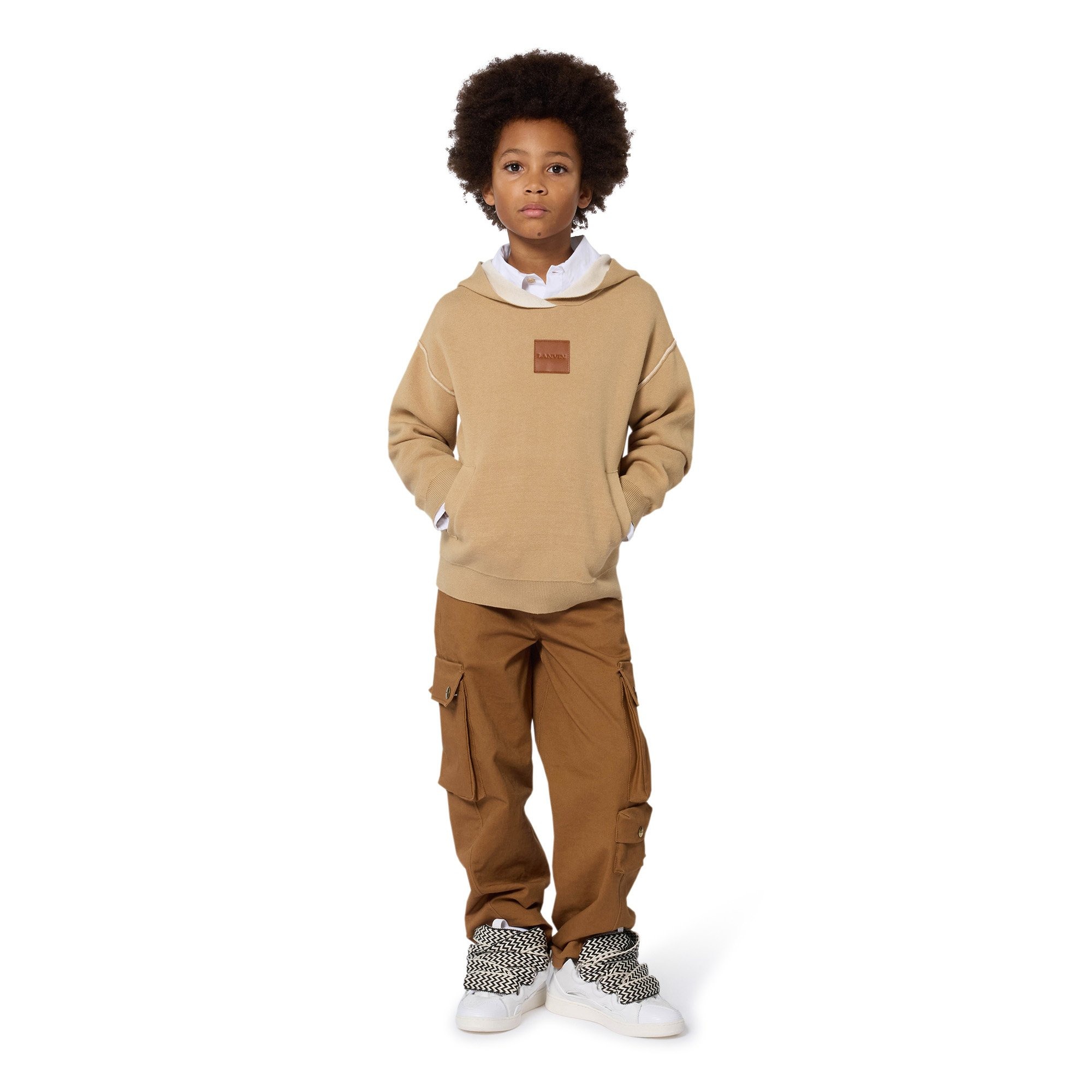 Questo maglione Lanvin unisce un look sportivo a un tocco di lusso. La felpa con cappuccio è disponibile in un colore beige-marrone chiaro, facile da abbinare e dal fascino senza tempo. Sul retro, la grande scritta Lanvin bianca aggiunge un dettaglio audace e sorprendente. Sul davanti, una toppa marrone sul petto riporta il nome del marchio in modo discreto. Il cappuccio conferisce al maglione un aspetto casual e confortevole, perfetto per l'uso quotidiano. Realizzato in materiale morbido, è piacevole al tatto e offre calore nelle giornate più fresche. La sua vestibilità moderna lo rende facile da abbinare sia ai jeans che ai jogger. Una felpa con cappuccio versatile ed elegante che unisce senza sforzo moda e comfort.
